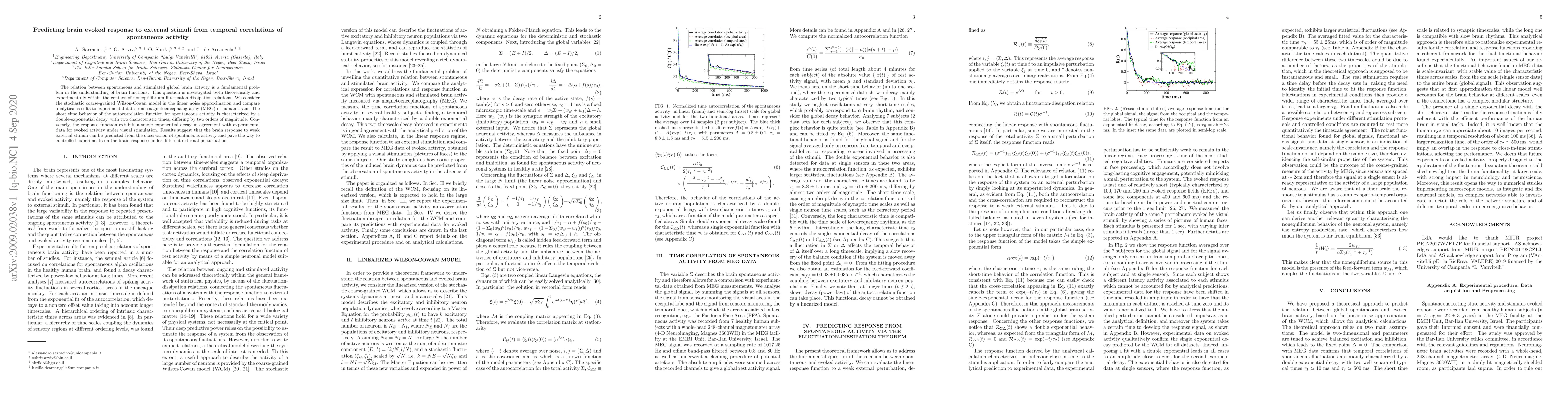 This paper investigates the link between spontaneous and evoked brain activity using a stochastic coarse-grained model and MEG data. It finds that spontaneous activity's short-time autocorrelation function has a double-exponential decay, while evoked responses show a single exponential decay, suggesting that spontaneous activity can predict brain responses to weak stimuli.