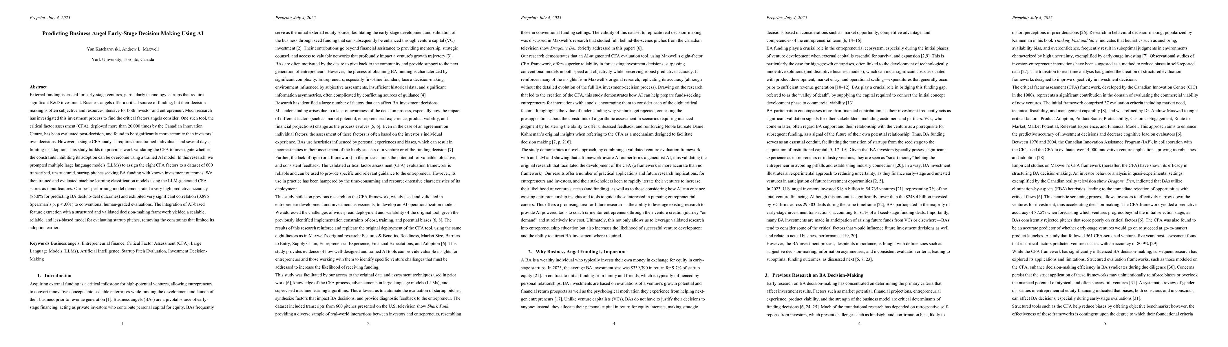External funding is crucial for early-stage ventures, particularly technology startups that require significant R&D investment. Business angels offer a critical source of funding, but their decision-making is often subjective and resource-intensive for both investor and entrepreneur. Much research has investigated this investment process to find the critical factors angels consider. One such tool, the Critical Factor Assessment (CFA), deployed more than 20,000 times by the Canadian Innovation Centre, has been evaluated post-decision and found to be significantly more accurate than investors' own decisions. However, a single CFA analysis requires three trained individuals and several days, limiting its adoption. This study builds on previous work validating the CFA to investigate whether the constraints inhibiting its adoption can be overcome using a trained AI model. In this research, we prompted multiple large language models (LLMs) to assign the eight CFA factors to a dataset of 600 transcribed, unstructured startup pitches seeking business angel funding with known investment outcomes. We then trained and evaluated machine learning classification models using the LLM-generated CFA scores as input features. Our best-performing model demonstrated high predictive accuracy (85.0% for predicting BA deal/no-deal outcomes) and exhibited significant correlation (Spearman's r = 0.896, p-value < 0.001) with conventional human-graded evaluations. The integration of AI-based feature extraction with a structured and validated decision-making framework yielded a scalable, reliable, and less-biased model for evaluating startup pitches, removing the constraints that previously limited adoption.
