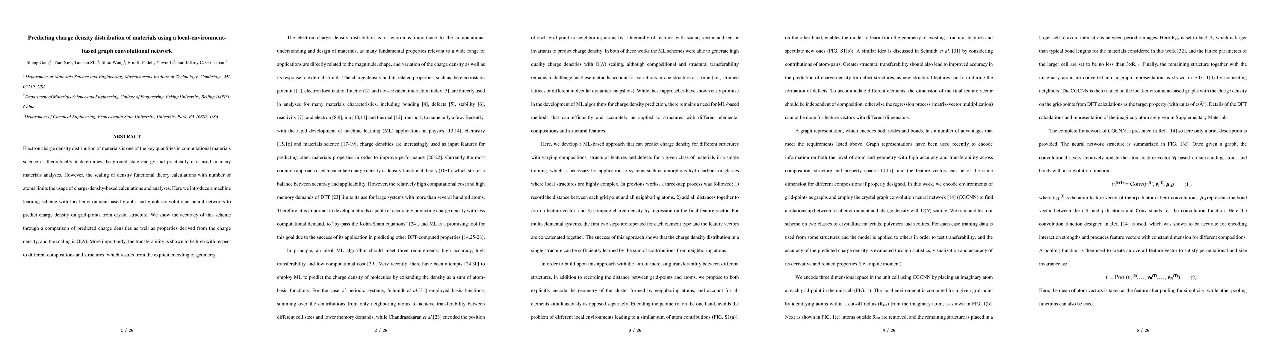 Electron charge density distribution of materials is one of the key quantities in computational materials science as theoretically it determines the ground state energy and practically it is used in many materials analyses. However, the scaling of density functional theory calculations with number of atoms limits the usage of charge-density-based calculations and analyses. Here we introduce a machine learning scheme with local-environment-based graphs and graph convolutional neural networks to predict charge density on grid-points from crystal structure. We show the accuracy of this scheme through a comparison of predicted charge densities as well as properties derived from the charge density, and the scaling is O(N). More importantly, the transferability is shown to be high with respect to different compositions and structures, which results from the explicit encoding of geometry.