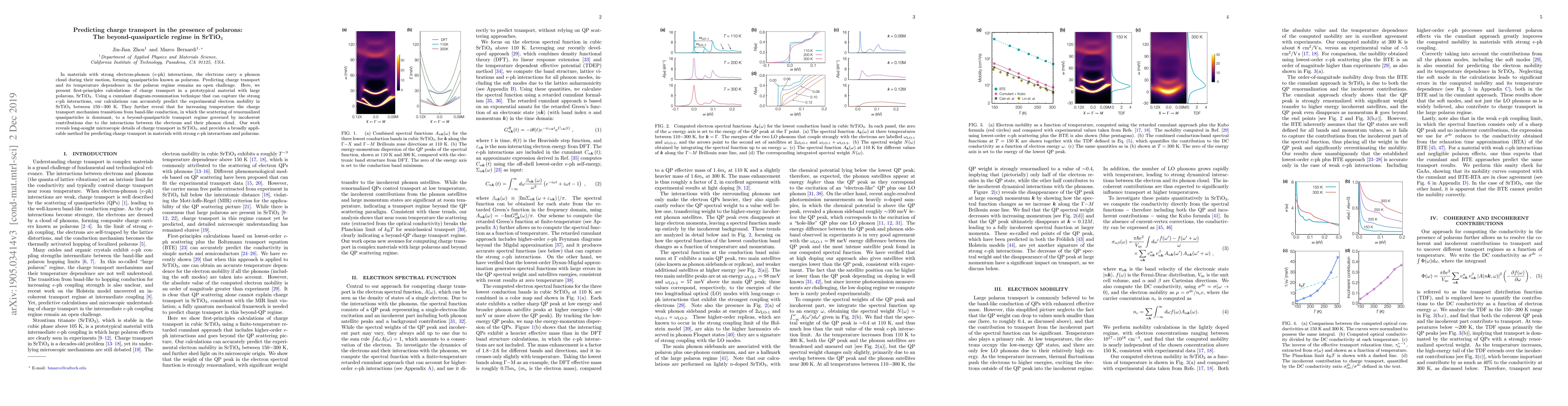 This research uses first-principles calculations to predict charge transport in SrTiO3, a material with large polarons. It reveals a transition from band-like quasiparticle conduction to a beyond-quasiparticle regime governed by electron-phonon interactions, accurately matching experimental electron mobility between 150-300K, and offers a method for predicting charge transport in similar materials.