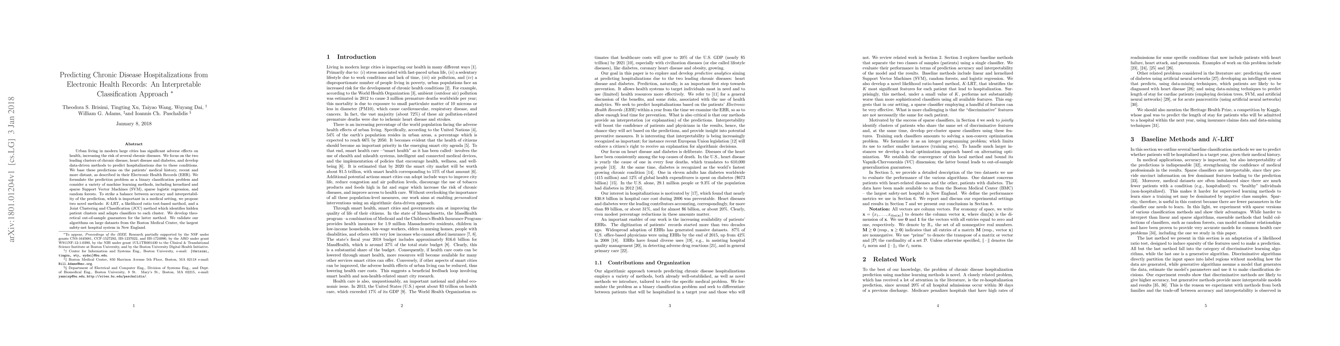 This paper develops data-driven methods to predict hospitalizations for heart disease and diabetes using Electronic Health Records, proposing K-LRT and Joint Clustering and Classification (JCC) methods for accurate and interpretable predictions, validated on Boston Medical Center data.