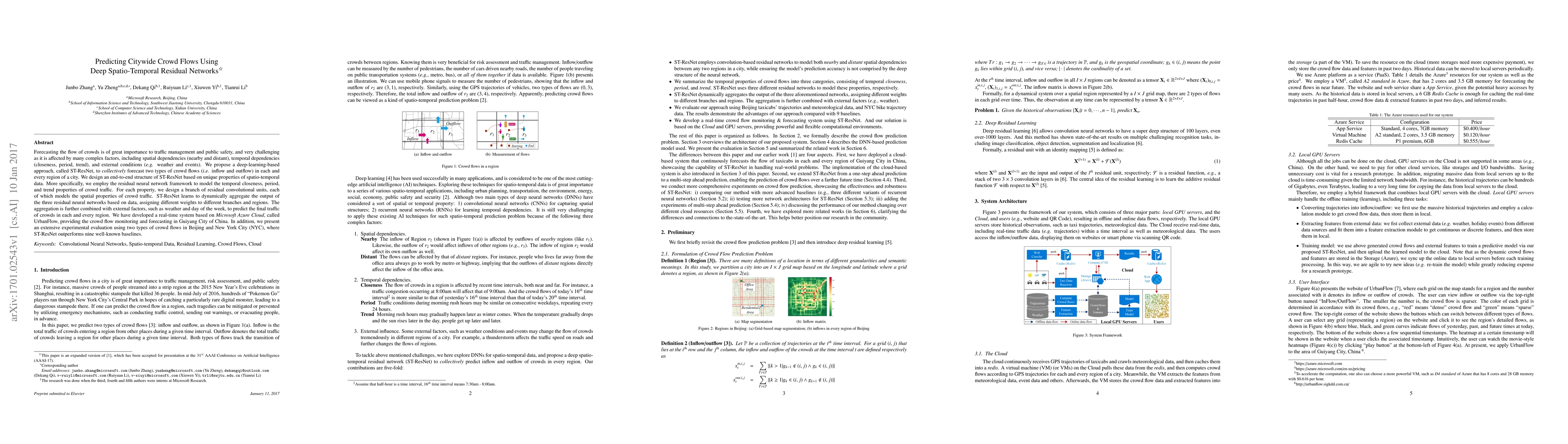 The paper proposes ST-ResNet, a deep-learning model that uses residual convolutional units to forecast citywide crowd flows by modeling spatial and temporal dependencies, and integrating external factors like weather. The model outperforms nine baselines in predicting crowd inflow and outflow in Beijing and New York City.