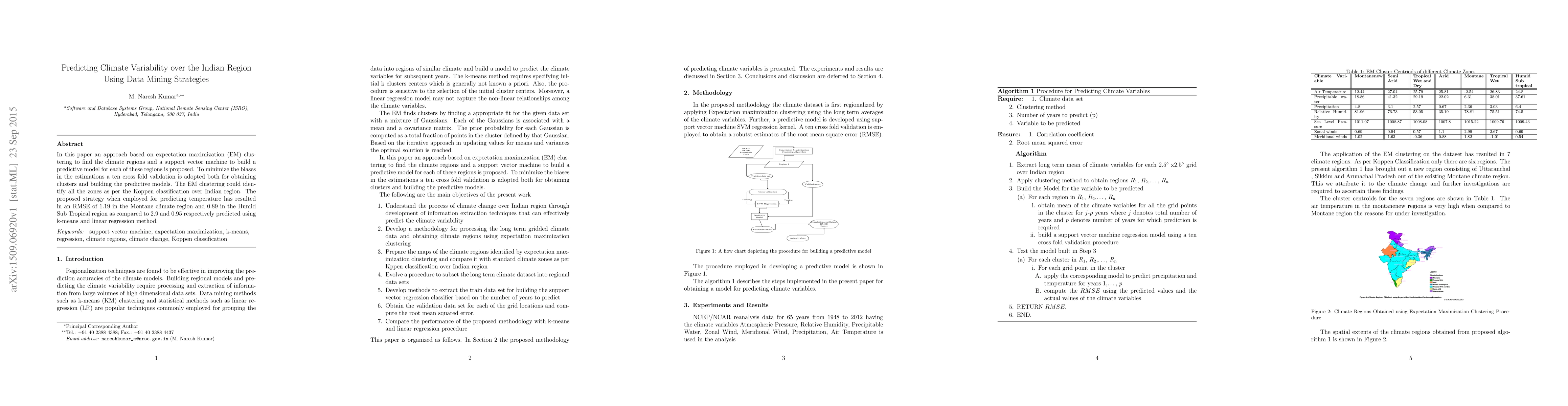 This paper proposes an EM clustering and support vector machine approach to predict climate variability in India, achieving lower RMSE values compared to k-means and linear regression, demonstrating improved accuracy in temperature predictions for different climate regions.