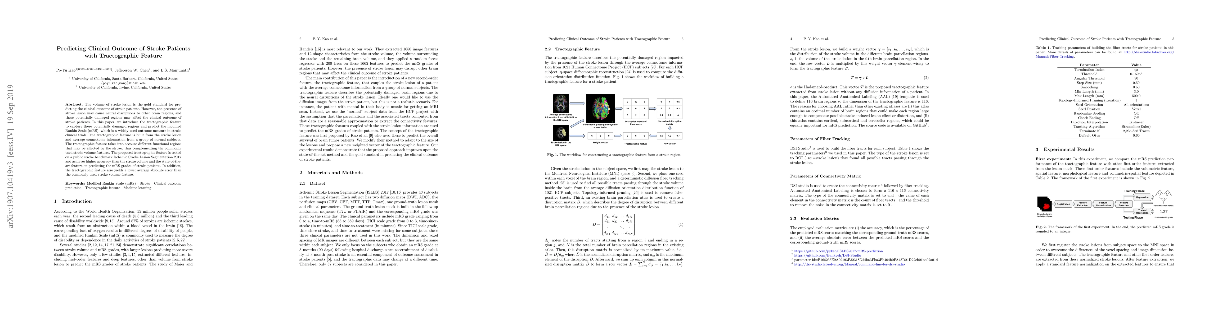 This paper introduces a tractographic feature to predict stroke patients' clinical outcomes by considering potentially damaged brain regions beyond the stroke lesion volume. It achieves higher accuracy and lower error in predicting the modified Rankin Scale compared to traditional stroke volume features.