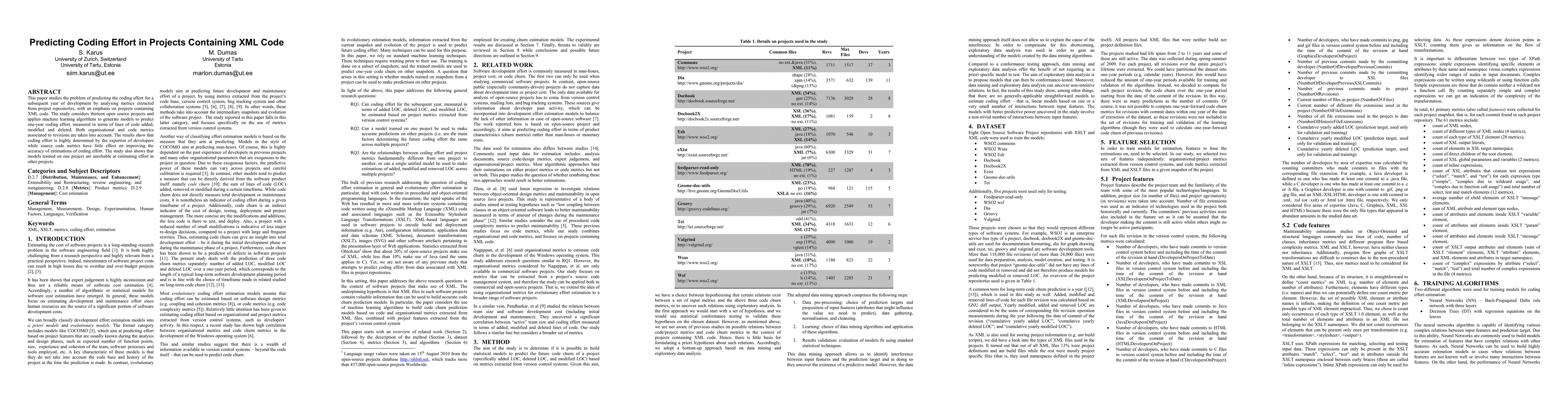 This paper studies the problem of predicting the coding effort for a subsequent year of development by analysing metrics extracted from project repositories, with an emphasis on projects containing XML code. The study considers thirteen open source projects and applies machine learning algorithms to generate models to predict one-year coding effort, measured in terms of lines of code added, modified and deleted. Both organisational and code metrics associated to revisions are taken into account. The results show that coding effort is highly determined by the expertise of developers while source code metrics have little effect on improving the accuracy of estimations of coding effort. The study also shows that models trained on one project are unreliable at estimating effort in other projects.