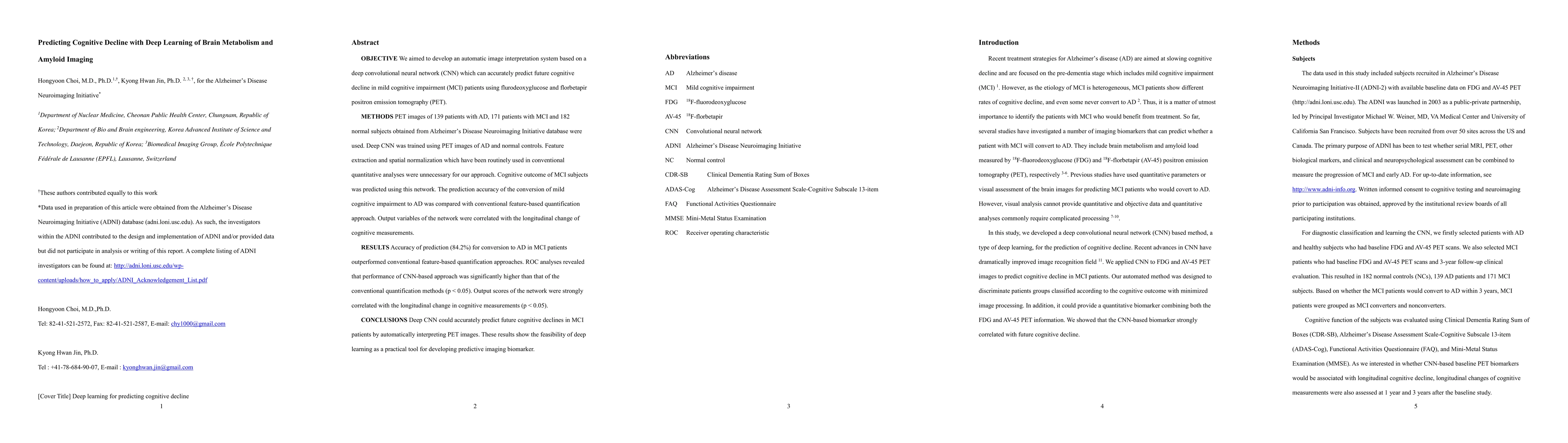 This study developed a deep convolutional neural network to predict cognitive decline in mild cognitive impairment patients using PET scans, achieving 84.2% accuracy. The method outperforms conventional quantification techniques and correlates strongly with longitudinal cognitive changes, demonstrating deep learning's potential for predicting Alzheimer's disease outcomes.