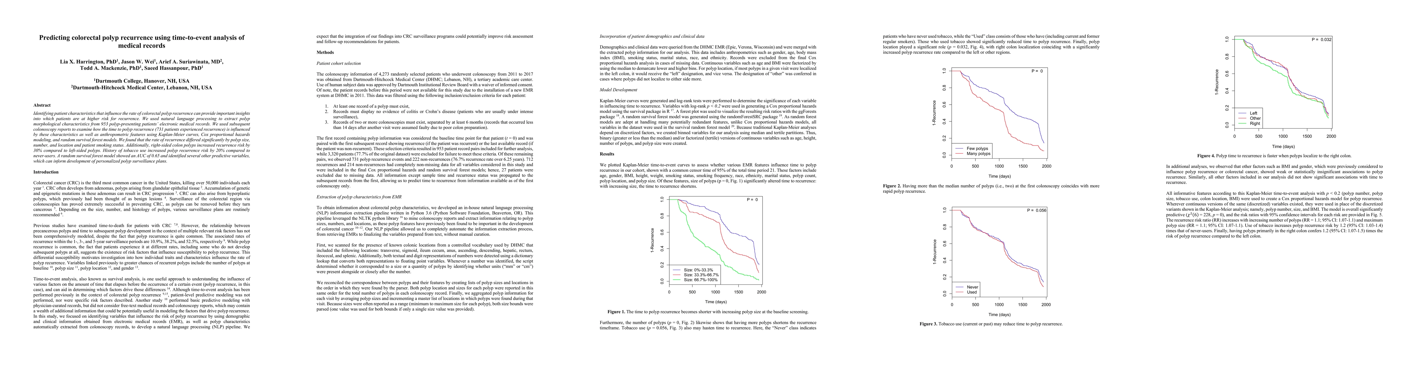 This study used NLP on medical records to identify colorectal polyp recurrence risk factors, finding that polyp size, number, location, and patient smoking status significantly influence recurrence rates. Right-sided colon polyps increased risk by 30% compared to left-sided ones, while tobacco use raised risk by 20%. A random survival forest model achieved an AUC of 0.65, suggesting personalized surveillance plans for high-risk patients.