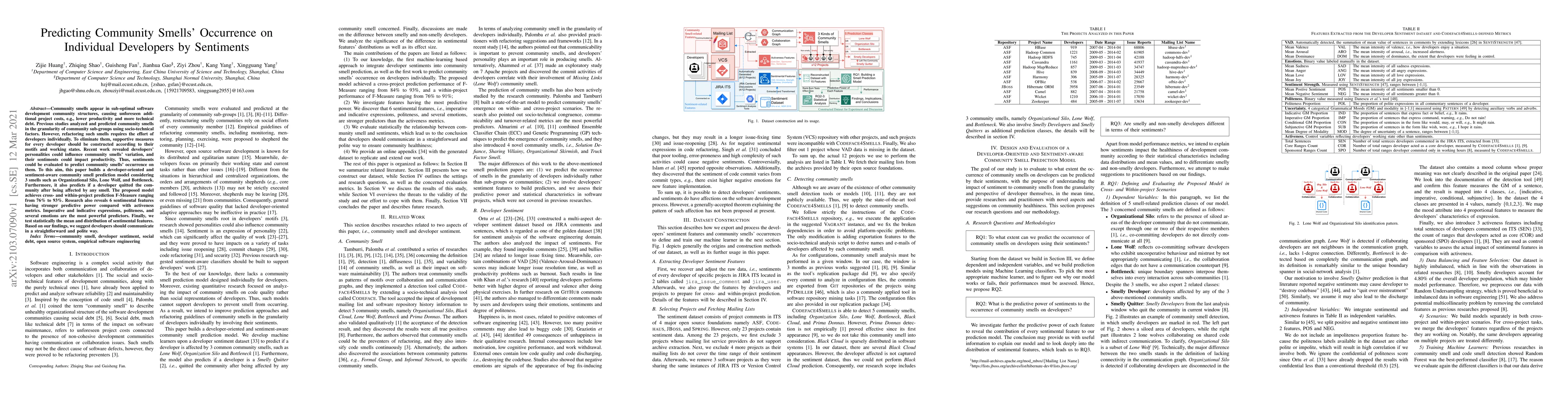 This research introduces a model predicting community smells impacting individual developers, focusing on sentiments. The model, considering smells like Organizational Silo, Lone Wolf, and Bottleneck, achieves high prediction accuracy. It identifies key sentimental features (e.g., use of imperative expressions, politeness) as more predictive than developer activity metrics. The study suggests developers should communicate straightforwardly and politely to mitigate these smells.