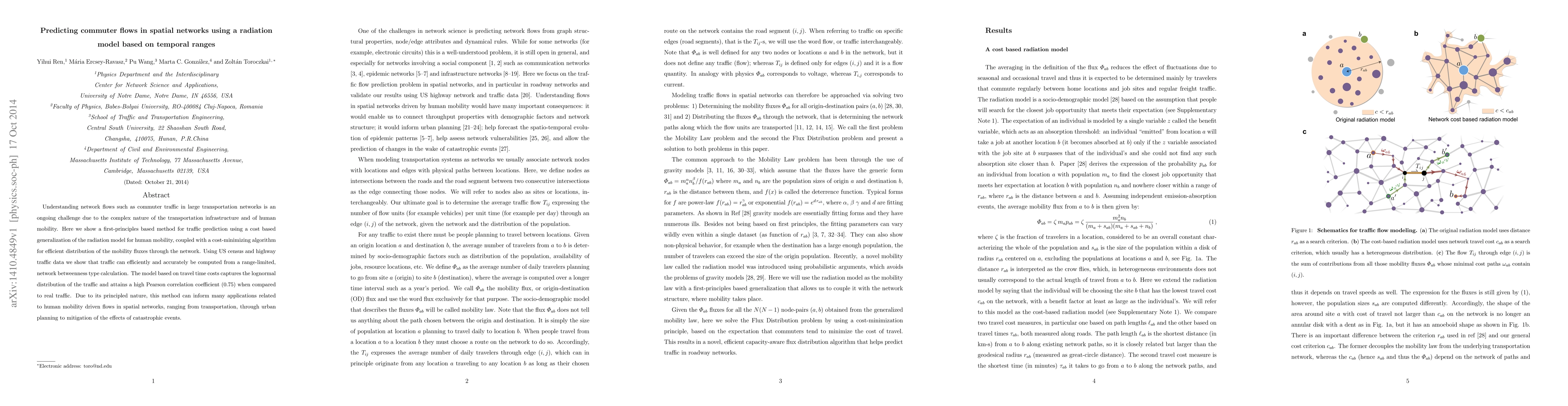 Understanding network flows such as commuter traffic in large transportation networks is an ongoing challenge due to the complex nature of the transportation infrastructure and of human mobility. Here we show a first-principles based method for traffic prediction using a cost based generalization of the radiation model for human mobility, coupled with a cost-minimizing algorithm for efficient distribution of the mobility fluxes through the network. Using US census and highway traffic data we show that traffic can efficiently and accurately be computed from a range-limited, network betweenness type calculation. The model based on travel time costs captures the lognormal distribution of the traffic and attains a high Pearson correlation coefficient (0.75) when compared to real traffic. Due to its principled nature, this method can inform many applications related to human mobility driven flows in spatial networks, ranging from transportation, through urban planning to mitigation of the effects of catastrophic events.