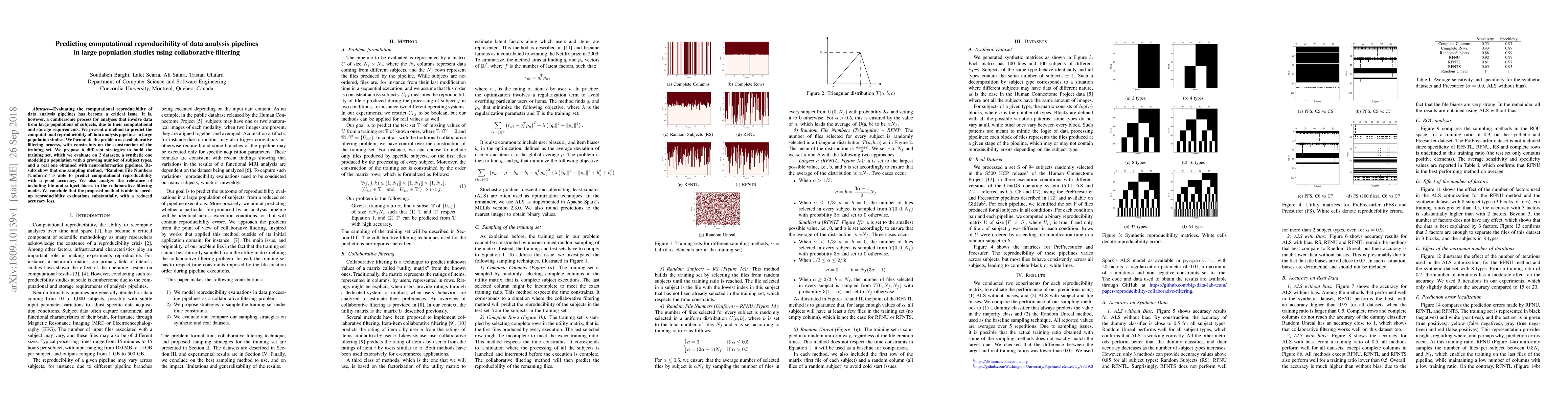 This paper proposes a collaborative filtering method to predict the computational reproducibility of data analysis pipelines in large population studies, demonstrating that the "Random File Numbers (Uniform)" sampling strategy offers good accuracy. The study evaluates six strategies on synthetic and real datasets, showing that the method can significantly speed up reproducibility evaluations with minimal loss in accuracy.