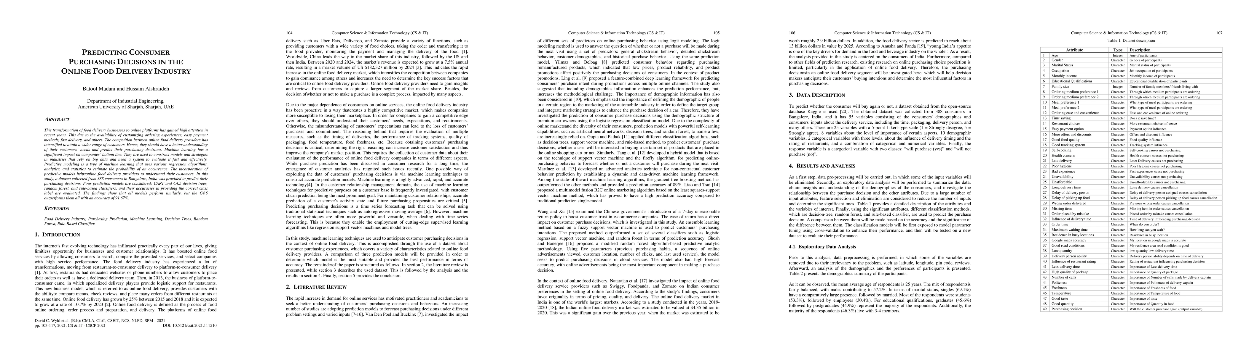 This study investigates predictive modeling techniques to forecast consumer purchasing decisions in the online food delivery industry, using a dataset from Bangalore, India. The C4.5 decision tree model was found to be the most accurate, achieving 91.67% accuracy among four considered models.