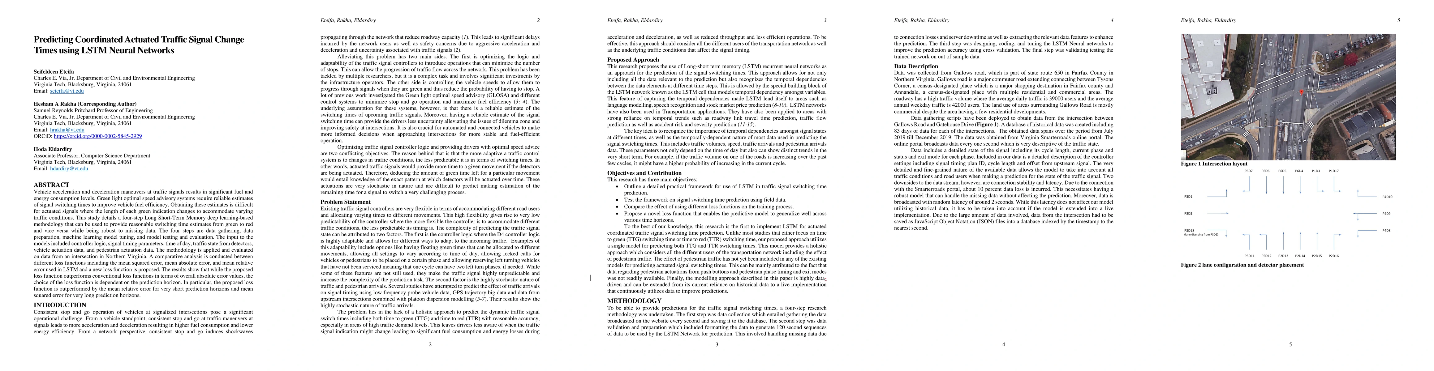 This study proposes a four-step LSTM-based methodology to predict traffic signal change times, aiming to improve fuel efficiency through optimal speed advisories. The methodology, evaluated on Northern Virginia data, shows that a new loss function outperforms traditional ones, though its effectiveness varies with prediction horizon.