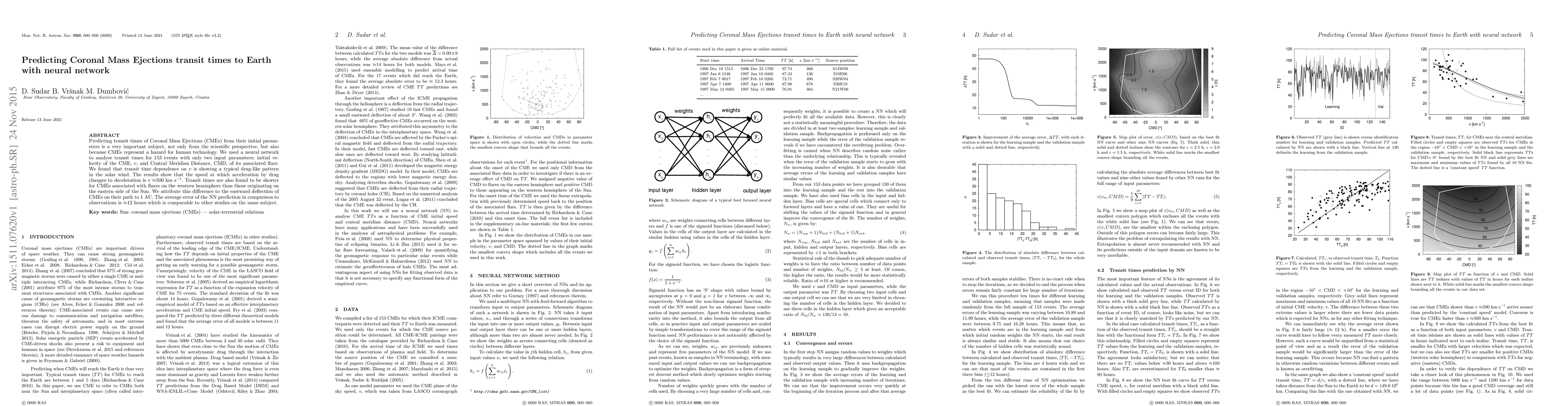 This paper uses a neural network to predict the transit times of Coronal Mass Ejections (CMEs) based on their initial velocity and Central Meridian Distance, achieving an average prediction error of about 12 hours. The study finds that CMEs associated with flares on the western side of the Sun have shorter transit times due to eastward deflection in the solar wind.