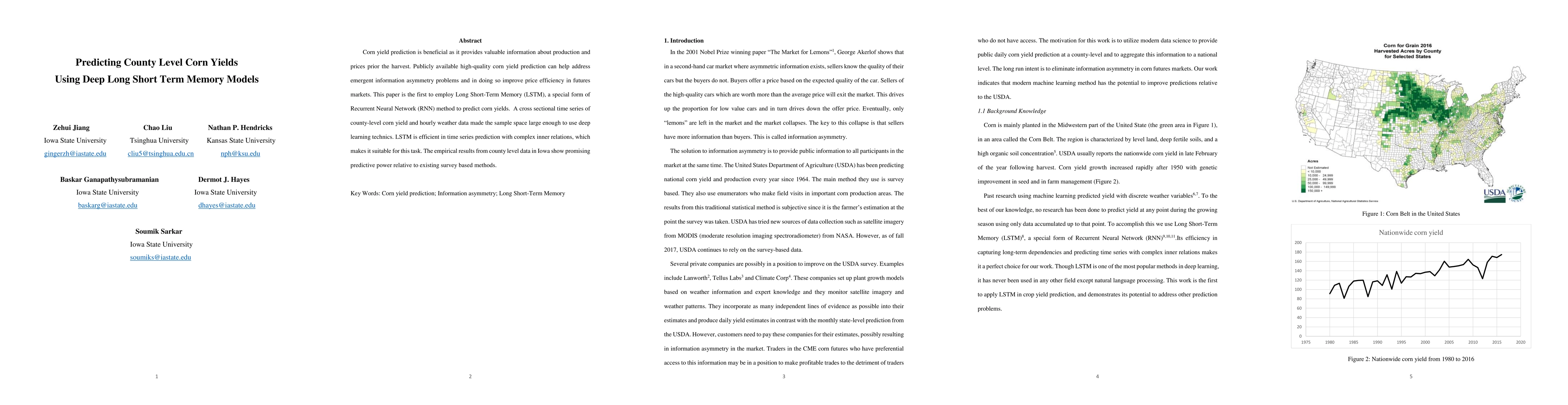 This paper employs Long Short-Term Memory (LSTM) models, a type of Recurrent Neural Network, to predict county-level corn yields using a large dataset of county-level corn yield and hourly weather data. The study demonstrates promising predictive accuracy compared to traditional survey-based methods, suggesting potential improvements in price efficiency in futures markets.
