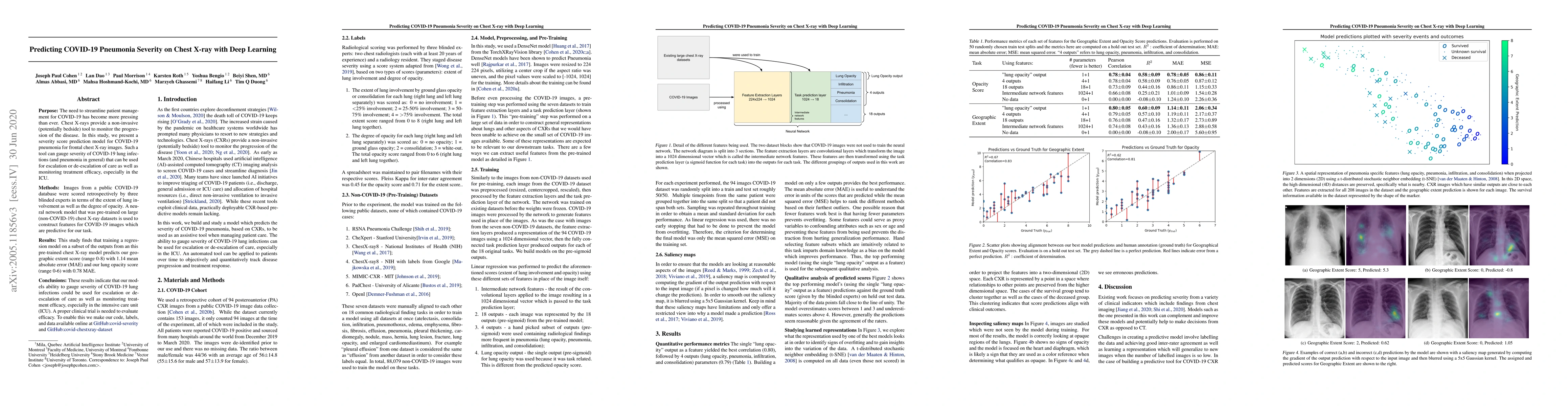 The study presents a severity score prediction model for COVID-19 pneumonia using frontal chest X-ray images. A pre-trained neural network model on large non-COVID-19 chest X-ray datasets extracts features for COVID-19 images, which are then used to predict severity scores.