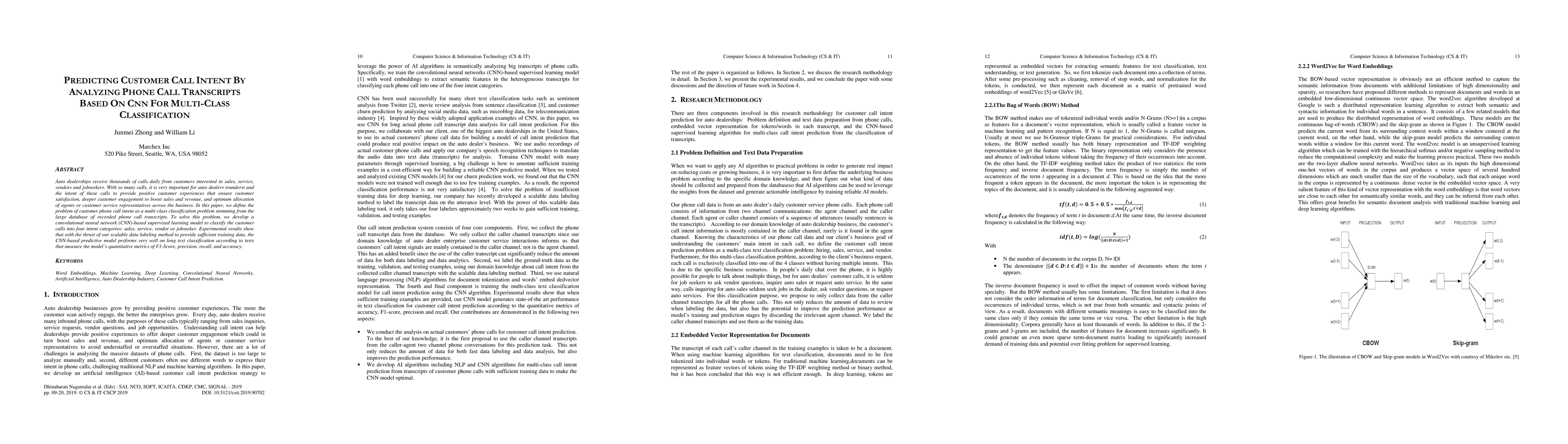 This paper proposes a CNN-based model to classify customer call intents from auto dealership phone call transcripts into sales, service, vendor, and jobseeker categories. Experimental results demonstrate the model's effectiveness in multi-class classification, achieving high F1-Score, precision, recall, and accuracy.
