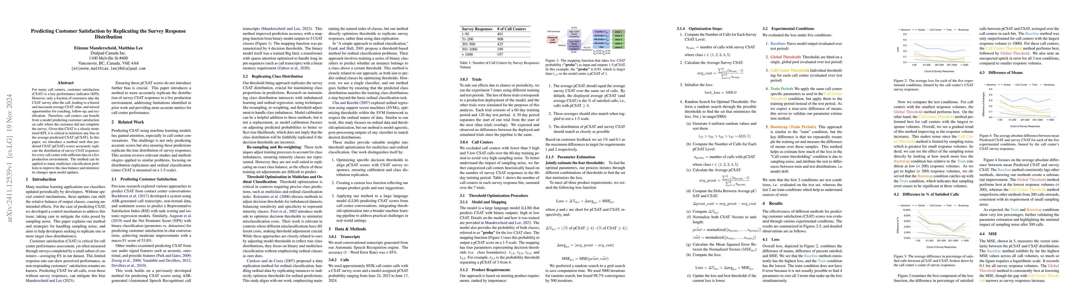 This paper proposes a method to predict customer satisfaction (CSAT) for calls where surveys were not completed, aiming to replicate the distribution of actual survey responses to minimize bias in average predicted CSAT scores. The technique can enhance class balance in multiclass classification problems and is applicable in live production environments.