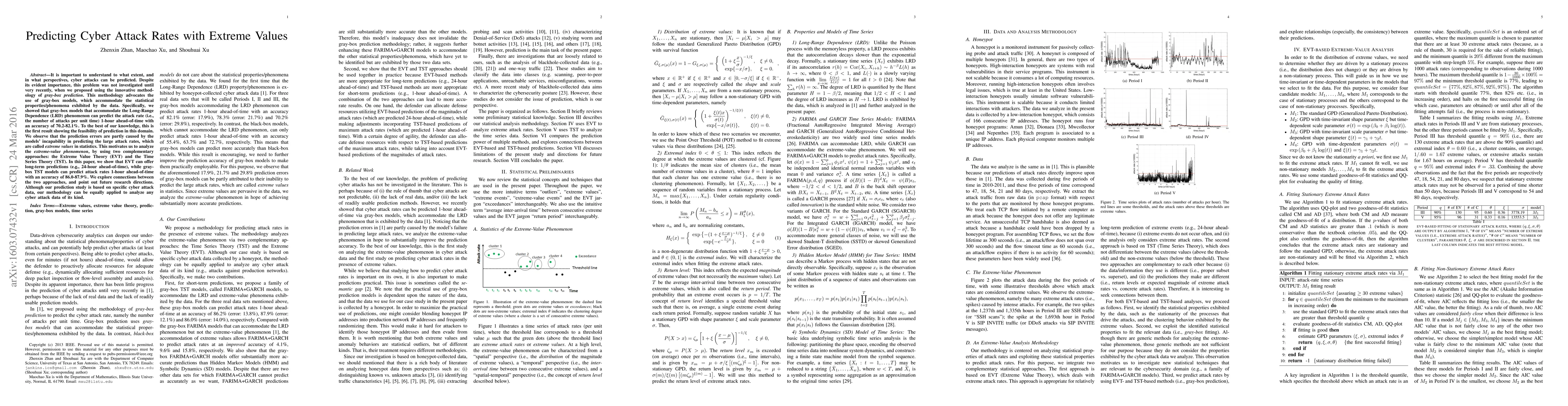 This paper introduces a gray-box prediction methodology to forecast cyber attack rates, achieving 1-hour ahead predictions with 70.2-82.1% accuracy. It further explores extreme values using Extreme Value Theory for long-term predictions and Time Series Theory for short-term predictions, achieving 86.0-87.9% accuracy for 1-hour forecasts.