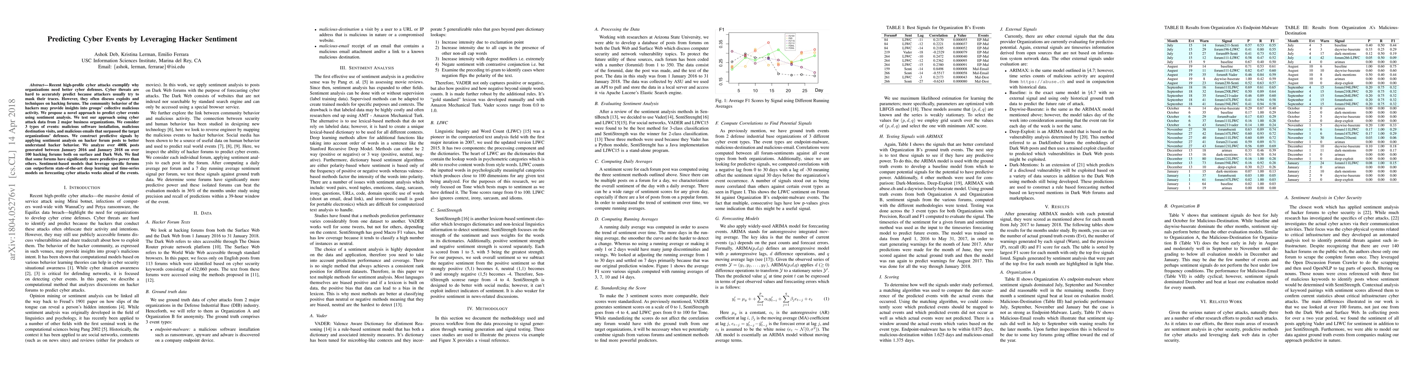 Researchers used sentiment analysis on hacker forum posts to predict cyber attacks, finding that certain forums provided more predictive power than others and outperforming traditional models.