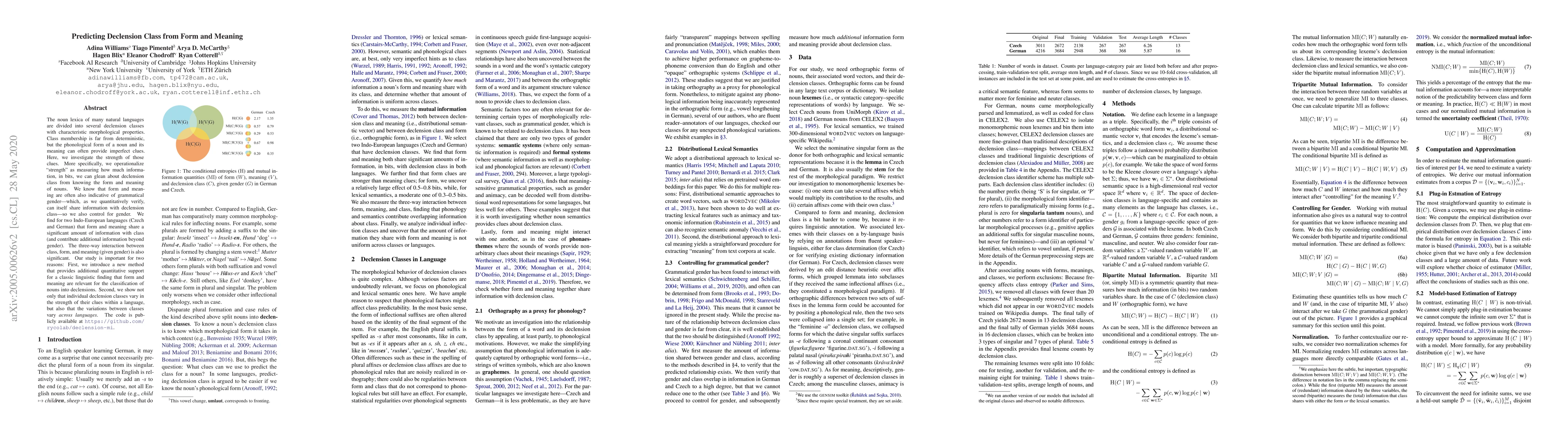 This study quantifies the information about noun declension class in Czech and German derived from form and meaning, controlling for grammatical gender. It finds that form and meaning provide significant clues about declension class, with variations in clue strength both within and between languages.