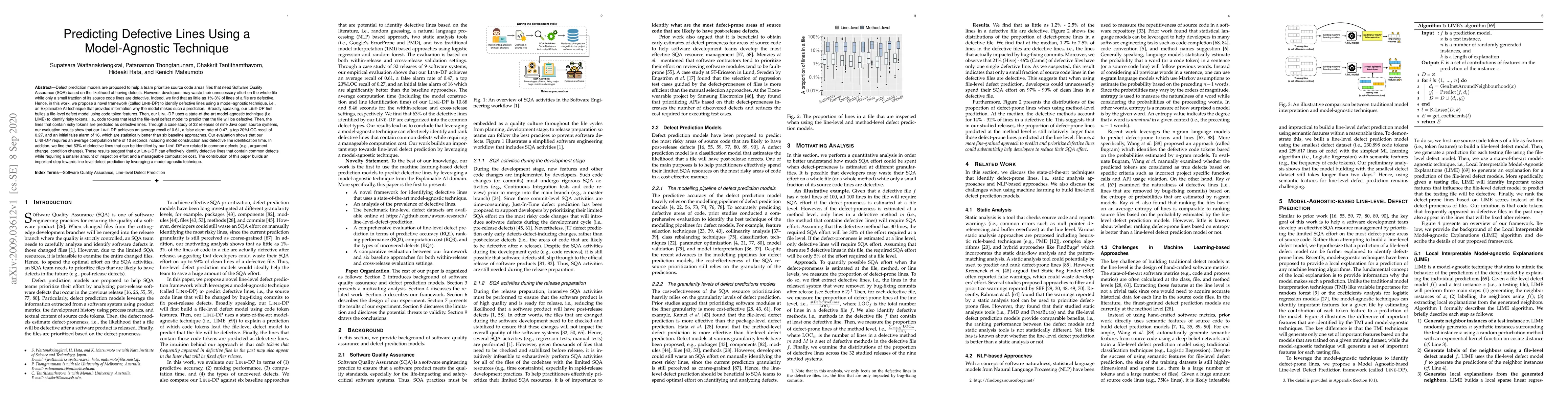 This research proposes a model-agnostic technique called LINE-DP to predict defective lines in source code files, achieving improved recall and false alarm rates while reducing computation time and inspection effort.