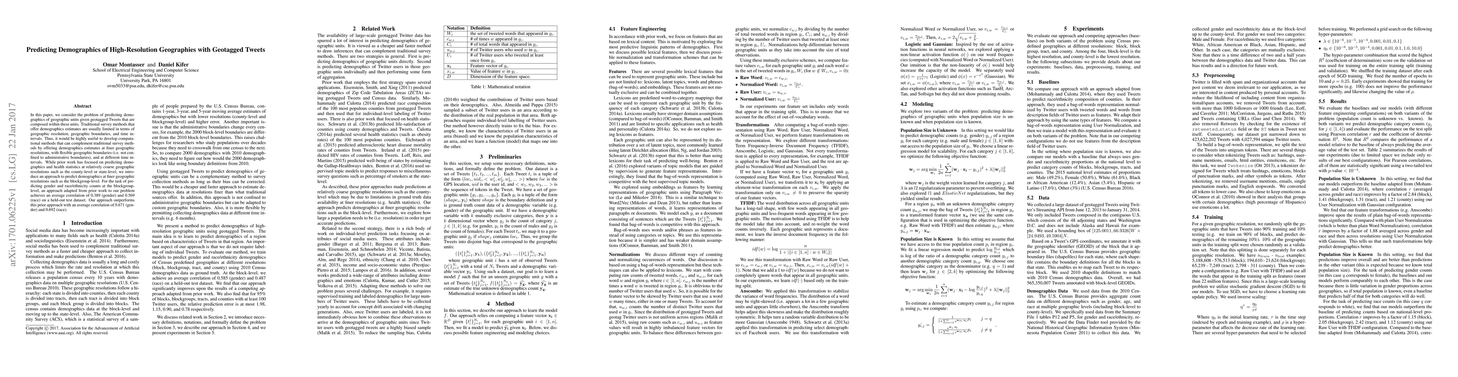 In this paper, we consider the problem of predicting demographics of geographic units given geotagged Tweets that are composed within these units. Traditional survey methods that offer demographics estimates are usually limited in terms of geographic resolution, geographic boundaries, and time intervals. Thus, it would be highly useful to develop computational methods that can complement traditional survey methods by offering demographics estimates at finer geographic resolutions, with flexible geographic boundaries (i.e. not confined to administrative boundaries), and at different time intervals. While prior work has focused on predicting demographics and health statistics at relatively coarse geographic resolutions such as the county-level or state-level, we introduce an approach to predict demographics at finer geographic resolutions such as the blockgroup-level. For the task of predicting gender and race/ethnicity counts at the blockgroup-level, an approach adapted from prior work to our problem achieves an average correlation of 0.389 (gender) and 0.569 (race) on a held-out test dataset. Our approach outperforms this prior approach with an average correlation of 0.671 (gender) and 0.692 (race).