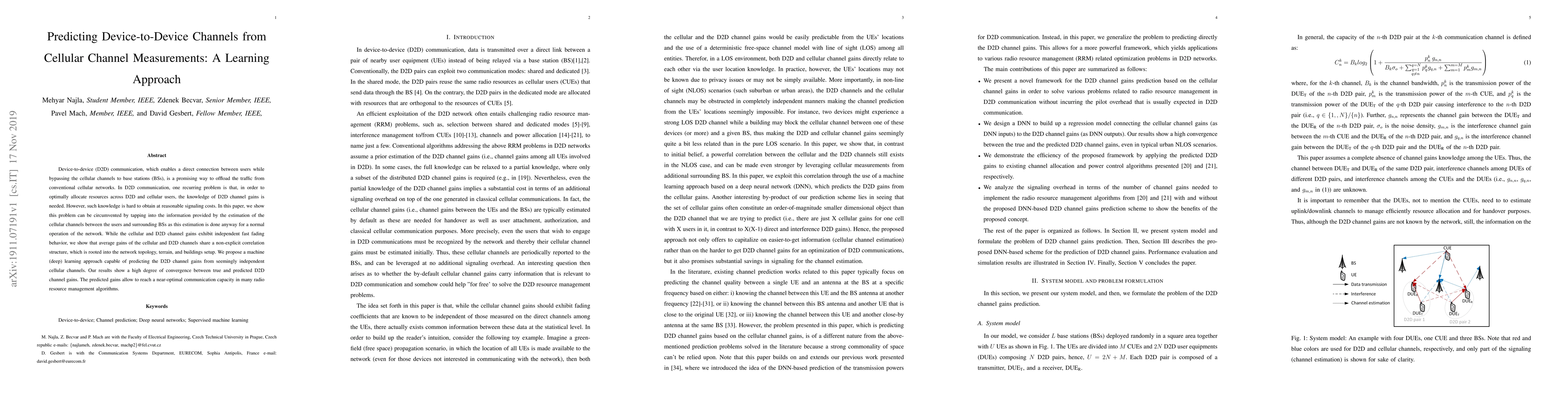 Device-to-device (D2D) communication, which enables a direct connection between users while bypassing the cellular channels to base stations (BSs), is a promising way to offload the traffic from conventional cellular networks. In D2D communication, one recurring problem is that, in order to optimally allocate resources across D2D and cellular users, the knowledge of D2D channel gains is needed. However, such knowledge is hard to obtain at reasonable signaling costs. In this paper, we show this problem can be circumvented by tapping into the information provided by the estimation of the cellular channels between the users and surrounding BSs as this estimation is done anyway for a normal operation of the network. While the cellular and D2D channel gains exhibit independent fast fading behavior, we show that average gains of the cellular and D2D channels share a non-explicit correlation structure, which is rooted into the network topology, terrain, and buildings setup. We propose a machine (deep) learning approach capable of predicting the D2D channel gains from seemingly independent cellular channels. Our results show a high degree of convergence between true and predicted D2D channel gains. The predicted gains allow to reach a near-optimal communication capacity in many radio resource management algorithms.