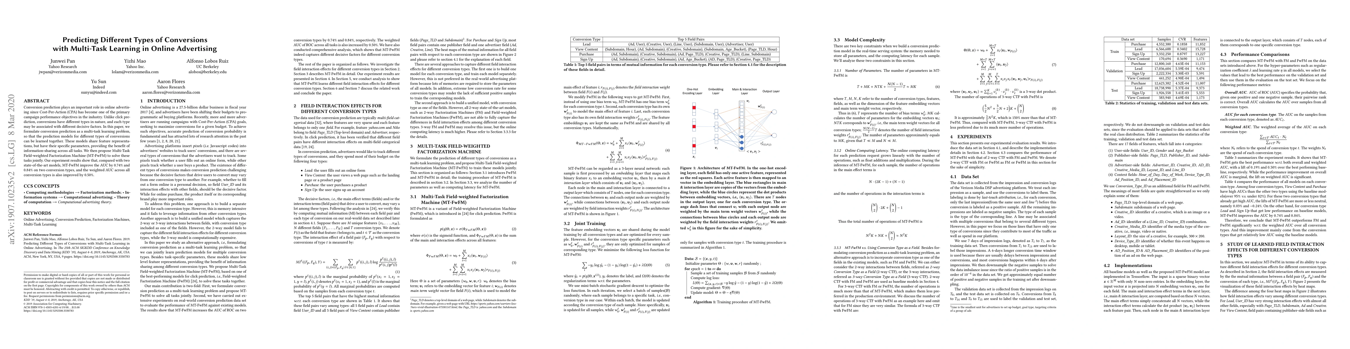This paper proposes a multi-task learning approach, Multi-Task Field-weighted Factorization Machine (MT-FwFM), to improve the prediction of different types of conversions in online advertising. The method shares feature representations across tasks, leading to better performance compared to state-of-the-art models, as evidenced by improved AUC metrics.