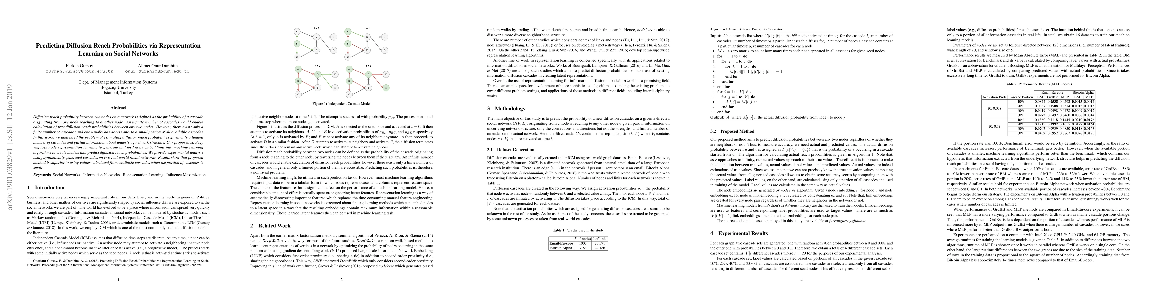 This paper proposes a method to estimate diffusion reach probabilities between nodes in social networks using representation learning to generate node embeddings, which are then fed into machine learning models. Experimental results on real-world networks demonstrate that the approach outperforms traditional methods when limited cascade data is available.