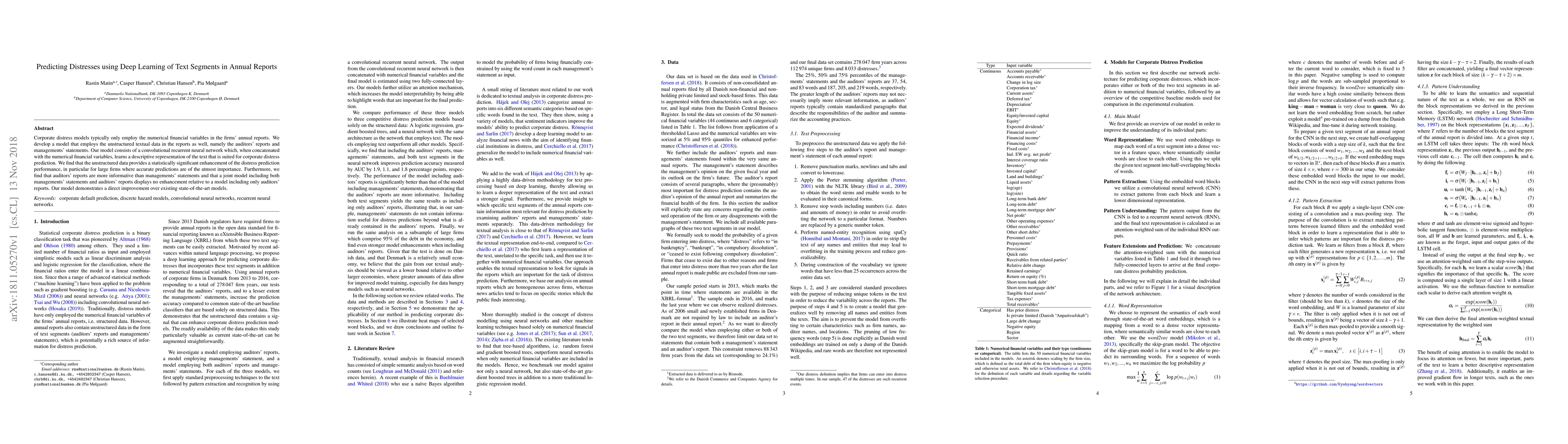 Corporate distress models typically only employ the numerical financial variables in the firms' annual reports. We develop a model that employs the unstructured textual data in the reports as well, namely the auditors' reports and managements' statements. Our model consists of a convolutional recurrent neural network which, when concatenated with the numerical financial variables, learns a descriptive representation of the text that is suited for corporate distress prediction. We find that the unstructured data provides a statistically significant enhancement of the distress prediction performance, in particular for large firms where accurate predictions are of the utmost importance. Furthermore, we find that auditors' reports are more informative than managements' statements and that a joint model including both managements' statements and auditors' reports displays no enhancement relative to a model including only auditors' reports. Our model demonstrates a direct improvement over existing state-of-the-art models.