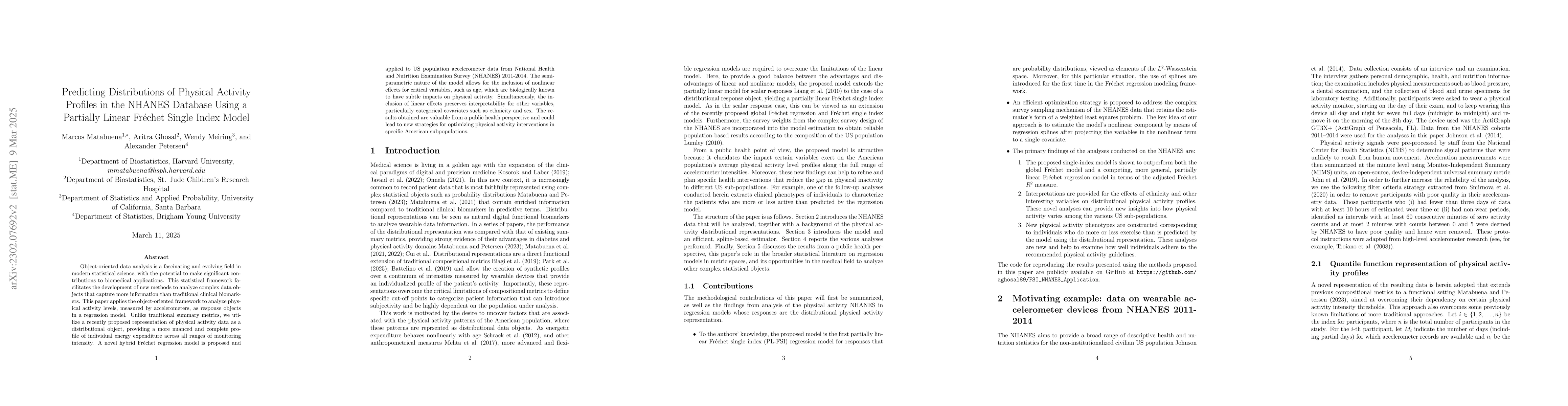 Object-oriented data analysis is a fascinating and developing field in modern statistical science with the potential to make significant and valuable contributions to biomedical applications. This statistical framework allows for the formalization of new methods to analyze complex data objects that capture more information than traditional clinical biomarkers. The paper applies the object-oriented framework to analyzing and predicting physical activity measured by accelerometers. As opposed to traditional summary metrics, we utilize a recently proposed representation of physical activity data as a distributional object, providing a more sophisticated and complete profile of individual energetic expenditure in all ranges of monitoring intensity. For the purpose of predicting these distributional objects, we propose a novel hybrid Frechet regression model and apply it to US population accelerometer data from NHANES 2011-2014. The semi-parametric character of the new model allows us to introduce non-linear effects for essential variables, such as age, that are known from a biological point of view to have nuanced effects on physical activity. At the same time, the inclusion of a global for linear term retains the advantage of interpretability for other variables, particularly categorical covariates such as ethnicity and sex. The results obtained in our analysis are helpful from a public health perspective and may lead to new strategies for optimizing physical activity interventions in specific American subpopulations.