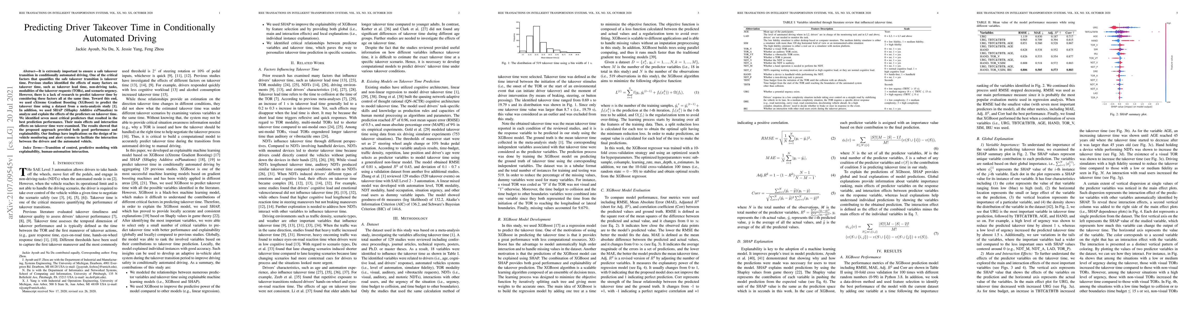 It is extremely important to ensure a safe takeover transition in conditionally automated driving. One of the critical factors that quantifies the safe takeover transition is takeover time. Previous studies identified the effects of many factors on takeover time, such as takeover lead time, non-driving tasks, modalities of the takeover requests (TORs), and scenario urgency. However, there is a lack of research to predict takeover time by considering these factors all at the same time. Toward this end, we used eXtreme Gradient Boosting (XGBoost) to predict the takeover time using a dataset from a meta-analysis study [1]. In addition, we used SHAP (SHapley Additive exPlanation) to analyze and explain the effects of the predictors on takeover time. We identified seven most critical predictors that resulted in the best prediction performance. Their main effects and interaction effects on takeover time were examined. The results showed that the proposed approach provided both good performance and explainability. Our findings have implications on the design of in-vehicle monitoring and alert systems to facilitate the interaction between the drivers and the automated vehicle.