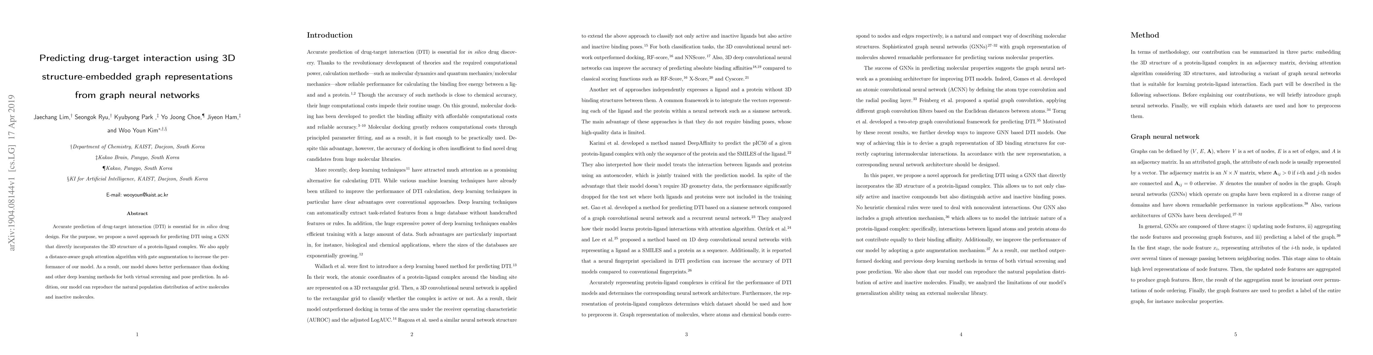 This paper proposes a novel graph neural network (GNN) approach to predict drug-target interactions by embedding 3D protein-ligand complex structures. The model uses a distance-aware graph attention mechanism with gate augmentation, demonstrating superior performance over docking and other deep learning methods for virtual screening and pose prediction.