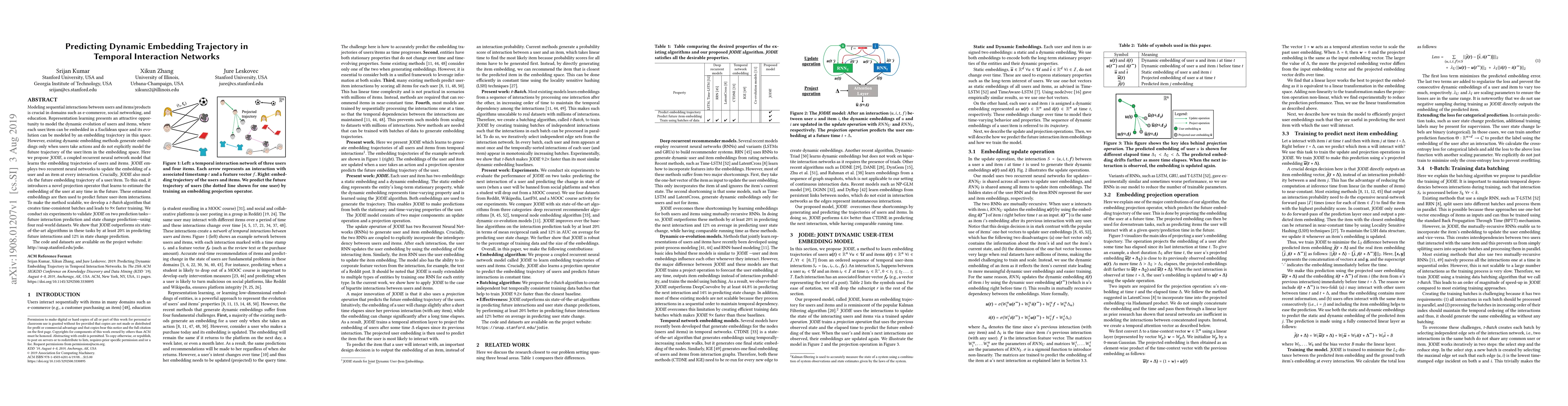 JODIE proposes a coupled recurrent neural network model to predict dynamic embedding trajectories in temporal interaction networks, introducing a novel projection operator for future embedding estimation. Experiments show JODIE outperforms state-of-the-art methods by at least 20% in future interaction prediction and 12% in state change prediction.