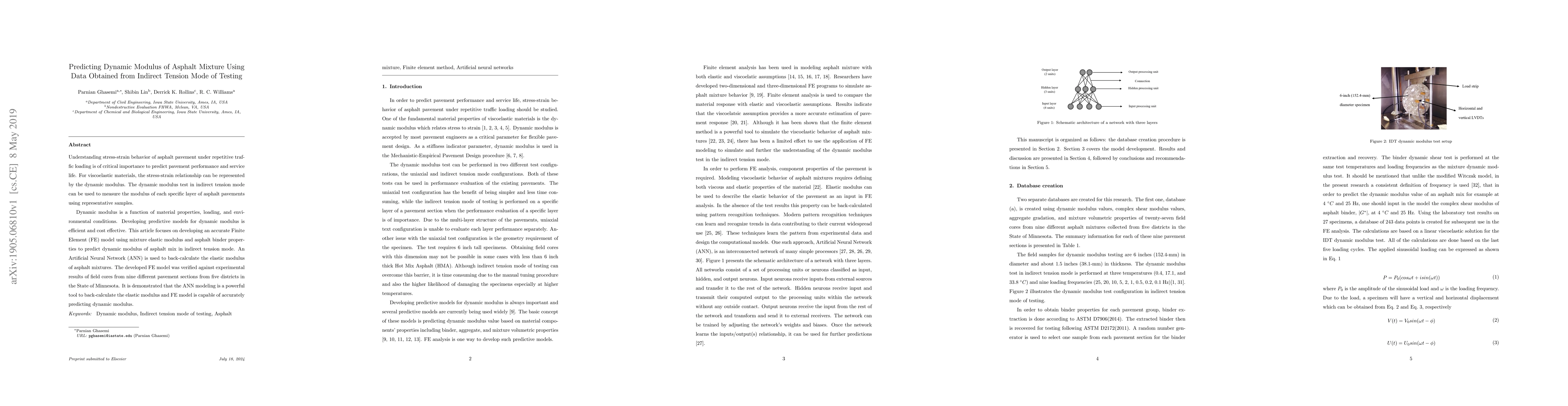 This paper develops a Finite Element model using Artificial Neural Networks to predict the dynamic modulus of asphalt mixtures based on data from indirect tension tests. The model, validated against field core samples, shows accurate predictions of dynamic modulus, highlighting the efficiency of ANN in back-calculating elastic modulus.