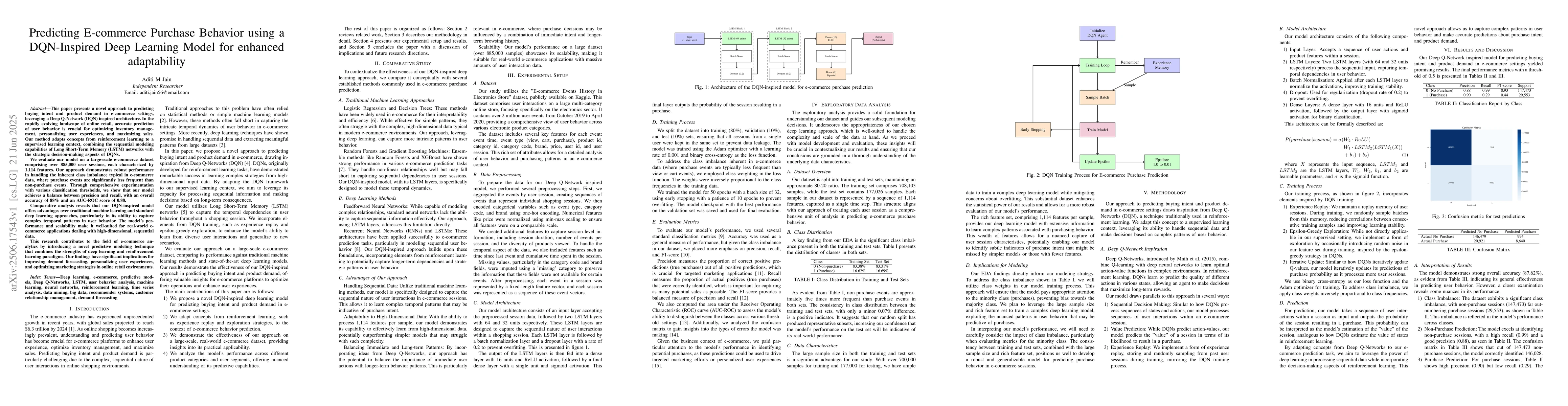 This paper presents a novel approach to predicting buying intent and product demand in e-commerce settings, leveraging a Deep Q-Network (DQN) inspired architecture. In the rapidly evolving landscape of online retail, accurate prediction of user behavior is crucial for optimizing inventory management, personalizing user experiences, and maximizing sales. Our method adapts concepts from reinforcement learning to a supervised learning context, combining the sequential modeling capabilities of Long Short-Term Memory (LSTM) networks with the strategic decision-making aspects of DQNs. We evaluate our model on a large-scale e-commerce dataset comprising over 885,000 user sessions, each characterized by 1,114 features. Our approach demonstrates robust performance in handling the inherent class imbalance typical in e-commerce data, where purchase events are significantly less frequent than non-purchase events. Through comprehensive experimentation with various classification thresholds, we show that our model achieves a balance between precision and recall, with an overall accuracy of 88\% and an AUC-ROC score of 0.88. Comparative analysis reveals that our DQN-inspired model offers advantages over traditional machine learning and standard deep learning approaches, particularly in its ability to capture complex temporal patterns in user behavior. The model's performance and scalability make it well-suited for real-world e-commerce applications dealing with high-dimensional, sequential data. This research contributes to the field of e-commerce analytics by introducing a novel predictive modeling technique that combines the strengths of deep learning and reinforcement learning paradigms. Our findings have significant implications for improving demand forecasting, personalizing user experiences, and optimizing marketing strategies in online retail environments.