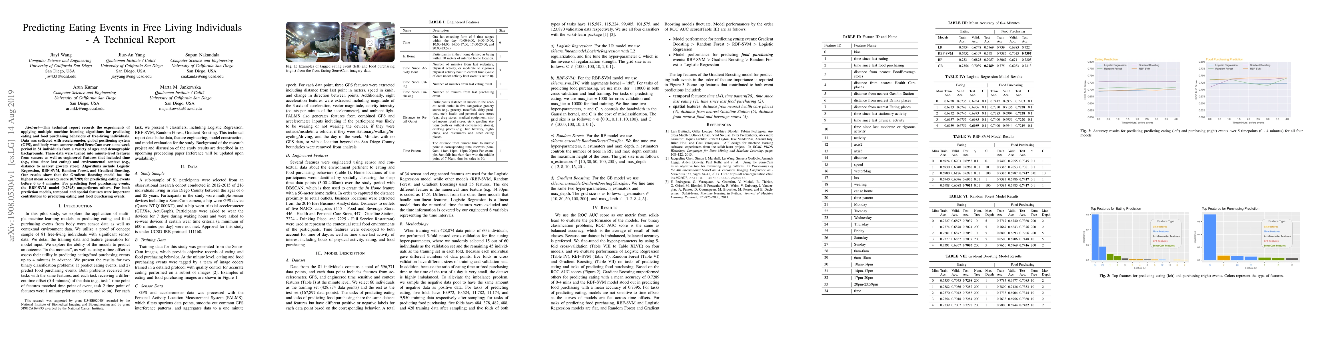 This report investigates the use of machine learning algorithms to predict eating and food purchasing behaviors in free-living individuals using data from accelerometers, GPS, and body-worn cameras. Gradient Boosting shows the highest accuracy for predicting eating events, while RBF-SVM is best for food purchasing events, highlighting the importance of temporal and spatial features.