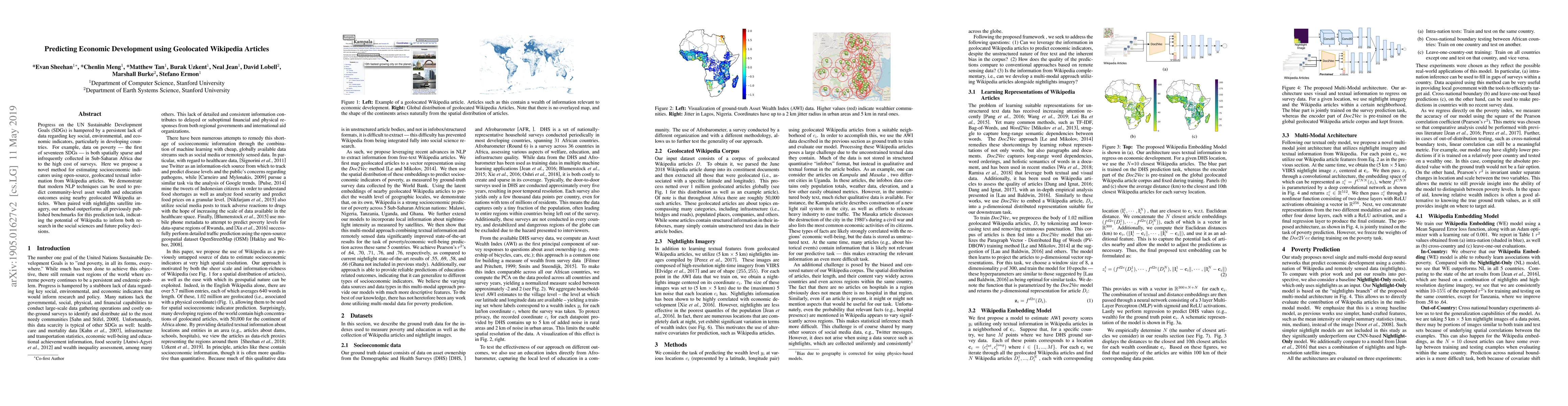 Progress on the UN Sustainable Development Goals (SDGs) is hampered by a persistent lack of data regarding key social, environmental, and economic indicators, particularly in developing countries. For example, data on poverty --- the first of seventeen SDGs --- is both spatially sparse and infrequently collected in Sub-Saharan Africa due to the high cost of surveys. Here we propose a novel method for estimating socioeconomic indicators using open-source, geolocated textual information from Wikipedia articles. We demonstrate that modern NLP techniques can be used to predict community-level asset wealth and education outcomes using nearby geolocated Wikipedia articles. When paired with nightlights satellite imagery, our method outperforms all previously published benchmarks for this prediction task, indicating the potential of Wikipedia to inform both research in the social sciences and future policy decisions.