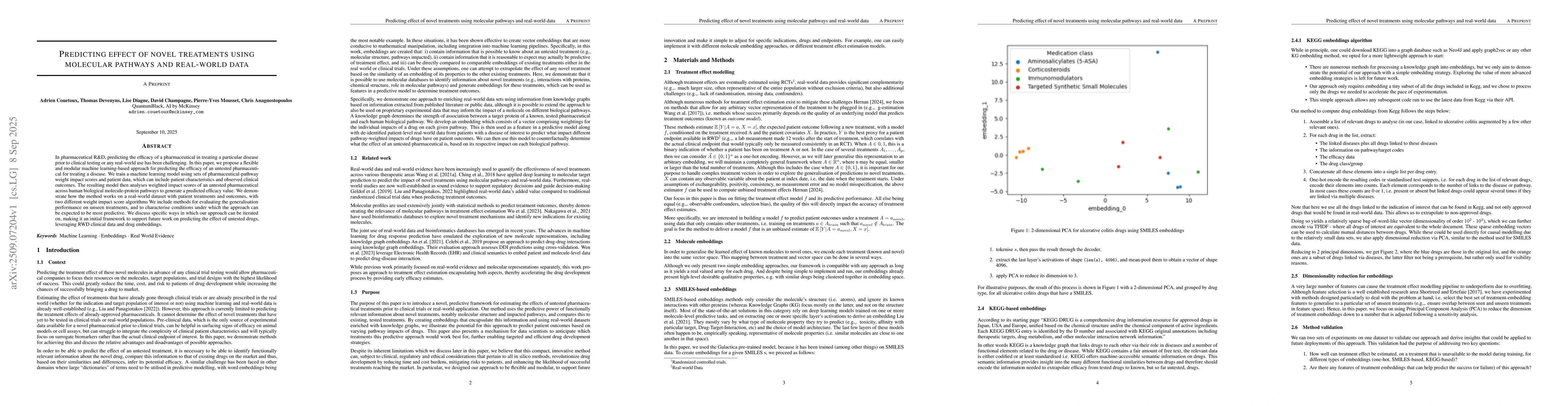 In pharmaceutical R&D, predicting the efficacy of a pharmaceutical in treating a particular disease prior to clinical testing or any real-world use has been challenging. In this paper, we propose a flexible and modular machine learning-based approach for predicting the efficacy of an untested pharmaceutical for treating a disease. We train a machine learning model using sets of pharmaceutical-pathway weight impact scores and patient data, which can include patient characteristics and observed clinical outcomes. The resulting model then analyses weighted impact scores of an untested pharmaceutical across human biological molecule-protein pathways to generate a predicted efficacy value. We demonstrate how the method works on a real-world dataset with patient treatments and outcomes, with two different weight impact score algorithms We include methods for evaluating the generalisation performance on unseen treatments, and to characterise conditions under which the approach can be expected to be most predictive. We discuss specific ways in which our approach can be iterated on, making it an initial framework to support future work on predicting the effect of untested drugs, leveraging RWD clinical data and drug embeddings.