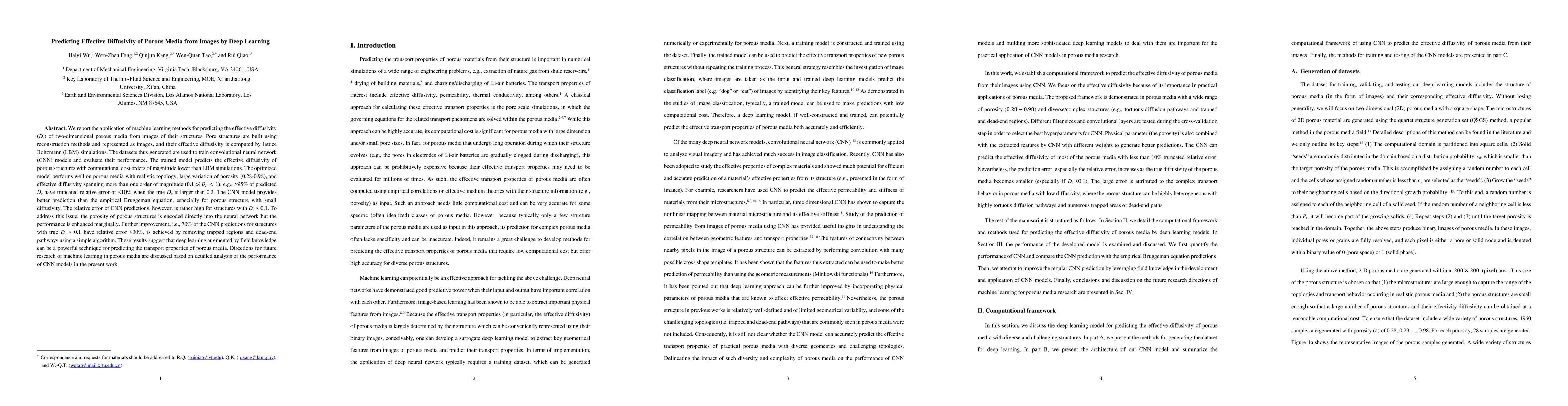 This research explores the use of convolutional neural networks (CNNs) to predict the effective diffusivity of two-dimensional porous media from structural images, demonstrating significant reductions in computational costs compared to traditional lattice Boltzmann simulations. The study highlights the potential of deep learning techniques enhanced by domain knowledge for predicting transport properties in porous media, though it notes areas for improvement in handling low diffusivity structures.