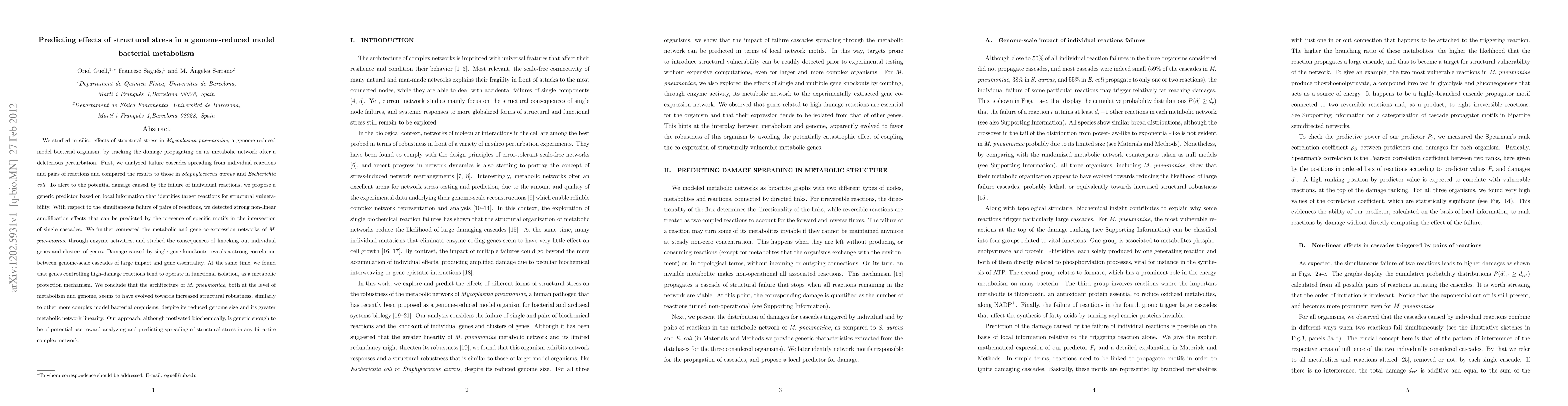 We studied in silico effects of structural stress in Mycoplasma pneumoniae, a genome-reduced model bacterial organism, by tracking the damage propagating on its metabolic network after a deleterious perturbation. First, we analyzed failure cascades spreading from individual reactions and pairs of reactions and compared the results to those in Staphylococcus aureus and Escherichia coli. To alert to the potential damage caused by the failure of individual reactions, we propose a generic predictor based on local information that identifies target reactions for structural vulnerability. With respect to the simultaneous failure of pairs of reactions, we detected strong non-linear amplification effects that can be predicted by the presence of specific motifs in the intersection of single cascades. We further connected the metabolic and gene co-expression networks of M. pneumoniae through enzyme activities, and studied the consequences of knocking out individual genes and clusters of genes. Damage caused by single gene knockouts reveals a strong correlation between genome-scale cascades of large impact and gene essentiality. At the same time, we found that genes controlling high-damage reactions tend to operate in functional isolation, as a metabolic protection mechanism. We conclude that the architecture of M. pneumoniae, both at the level of metabolism and genome, seems to have evolved towards increased structural robustness, similarly to other more complex model bacterial organisms, despite its reduced genome size and its greater metabolic network linearity. Our approach, although motivated biochemically, is generic enough to be of potential use toward analyzing and predicting spreading of structural stress in any bipartite complex network.