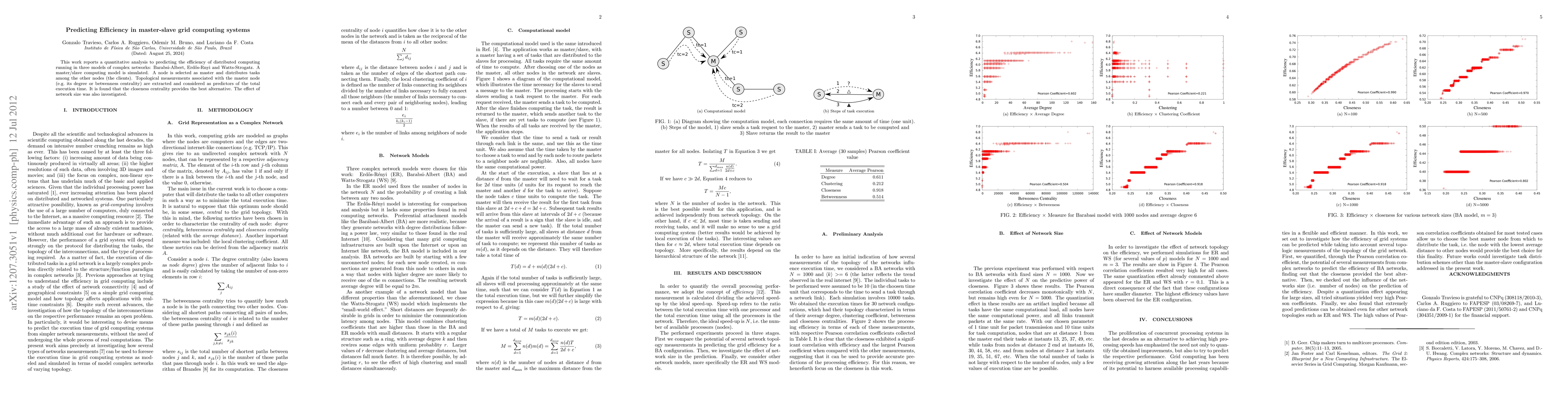 This paper analyzes efficiency in master-slave grid computing systems using three complex network models. It finds that closeness centrality is the best predictor of execution time, with the effect of network size also being investigated.