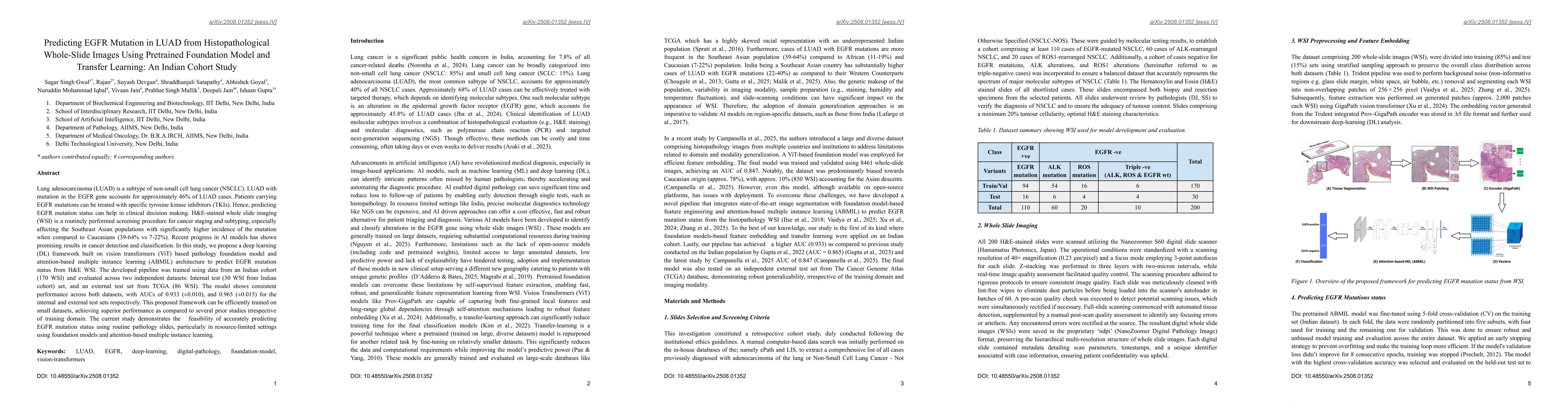 Lung adenocarcinoma (LUAD) is a subtype of non-small cell lung cancer (NSCLC). LUAD with mutation in the EGFR gene accounts for approximately 46% of LUAD cases. Patients carrying EGFR mutations can be treated with specific tyrosine kinase inhibitors (TKIs). Hence, predicting EGFR mutation status can help in clinical decision making. H&E-stained whole slide imaging (WSI) is a routinely performed screening procedure for cancer staging and subtyping, especially affecting the Southeast Asian populations with significantly higher incidence of the mutation when compared to Caucasians (39-64% vs 7-22%). Recent progress in AI models has shown promising results in cancer detection and classification. In this study, we propose a deep learning (DL) framework built on vision transformers (ViT) based pathology foundation model and attention-based multiple instance learning (ABMIL) architecture to predict EGFR mutation status from H&E WSI. The developed pipeline was trained using data from an Indian cohort (170 WSI) and evaluated across two independent datasets: Internal test (30 WSI from Indian cohort) set, and an external test set from TCGA (86 WSI). The model shows consistent performance across both datasets, with AUCs of 0.933 (+/-0.010), and 0.965 (+/-0.015) for the internal and external test sets respectively. This proposed framework can be efficiently trained on small datasets, achieving superior performance as compared to several prior studies irrespective of training domain. The current study demonstrates the feasibility of accurately predicting EGFR mutation status using routine pathology slides, particularly in resource-limited settings using foundation models and attention-based multiple instance learning.