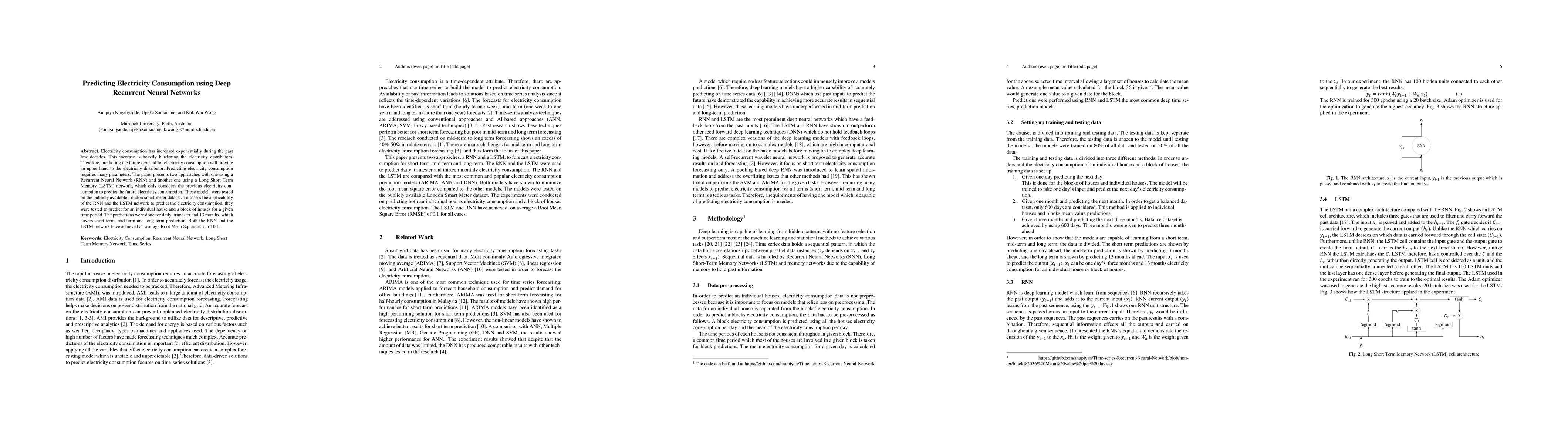 This paper explores the use of Recurrent Neural Networks (RNN) and Long Short Term Memory (LSTM) networks to predict electricity consumption based on historical data, tested on a London smart meter dataset. Both models demonstrated comparable performance with an average RMSE of 0.1, showing effectiveness for short, mid, and long-term forecasts.