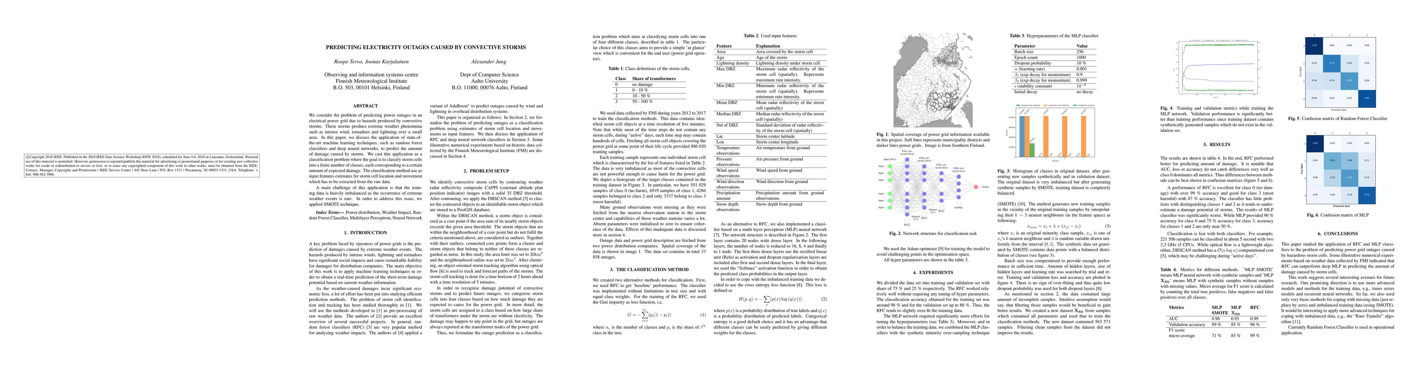 We consider the problem of predicting power outages in an electrical power grid due to hazards produced by convective storms. These storms produce extreme weather phenomena such as intense wind, tornadoes and lightning over a small area. In this paper, we discuss the application of state-of-the-art machine learning techniques, such as random forest classifiers and deep neural networks, to predict the amount of damage caused by storms. We cast this application as a classification problem where the goal is to classify storm cells into a finite number of classes, each corresponding to a certain amount of expected damage. The classification method use as input features estimates for storm cell location and movement which has to be extracted from the raw data. A main challenge of this application is that the training data is heavily imbalanced as the occurrence of extreme weather events is rare. In order to address this issue, we applied SMOTE technique.