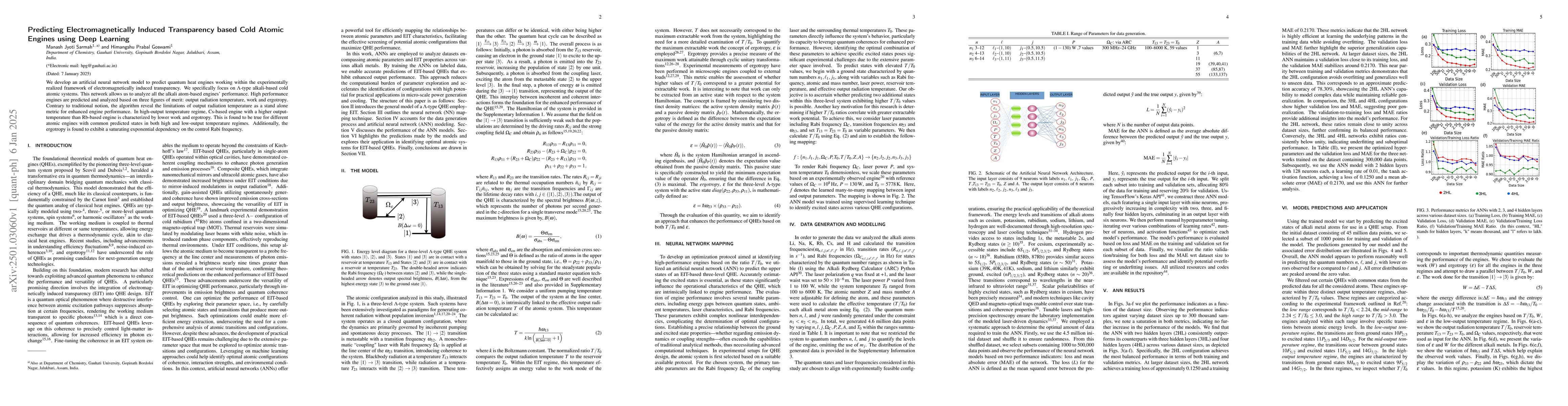 We develop an artificial neural network model to predict quantum heat engines working within the experimentally realized framework of electromagnetically induced transparency. We specifically focus on {\Lambda}-type alkali-based cold atomic systems. This network allows us to analyze all the alkali atom-based engines' performance. High performance engines are predicted and analyzed based on three figures of merit output, radiation temperature, work and ergotropy. Contrary to traditional notion, the algorithm reveal the limitations of output radiation temperature as a stand alone metric for enhanced engine performance. In high output temperature regime, Cs based engine with a higher output temperature than Rb based engine is characterized by lower work and ergotropy. This is found to be true for different atomic engines with common predicted states in both high and low output temperature regimes. Additionally, the ergotropy is found to exhibit a saturating exponential dependency on the control Rabi frequency.