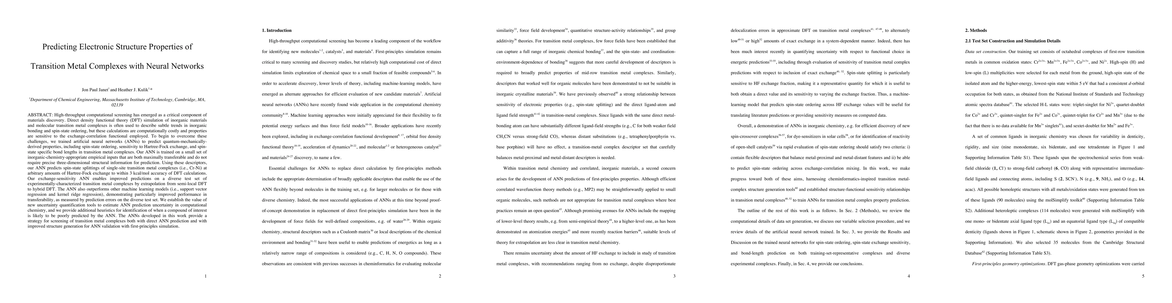 High-throughput computational screening has emerged as a critical component of materials discovery. Direct density functional theory (DFT) simulation of inorganic materials and molecular transition metal complexes is often used to describe subtle trends in inorganic bonding and spin-state ordering, but these calculations are computationally costly and properties are sensitive to the exchange-correlation functional employed. To begin to overcome these challenges, we trained artificial neural networks (ANNs) to predict quantum-mechanically-derived properties, including spin-state ordering, sensitivity to Hartree-Fock exchange, and spin- state specific bond lengths in transition metal complexes. Our ANN is trained on a small set of inorganic-chemistry-appropriate empirical inputs that are both maximally transferable and do not require precise three-dimensional structural information for prediction. Using these descriptors, our ANN predicts spin-state splittings of single-site transition metal complexes (i.e., Cr-Ni) at arbitrary amounts of Hartree-Fock exchange to within 3 kcal/mol accuracy of DFT calculations. Our exchange-sensitivity ANN enables improved predictions on a diverse test set of experimentally-characterized transition metal complexes by extrapolation from semi-local DFT to hybrid DFT. The ANN also outperforms other machine learning models (i.e., support vector regression and kernel ridge regression), demonstrating particularly improved performance in transferability, as measured by prediction errors on the diverse test set. We establish the value of new uncertainty quantification tools to estimate ANN prediction uncertainty in computational chemistry, and we provide additional heuristics for identification of when a compound of interest is likely to be poorly predicted by the ANN.