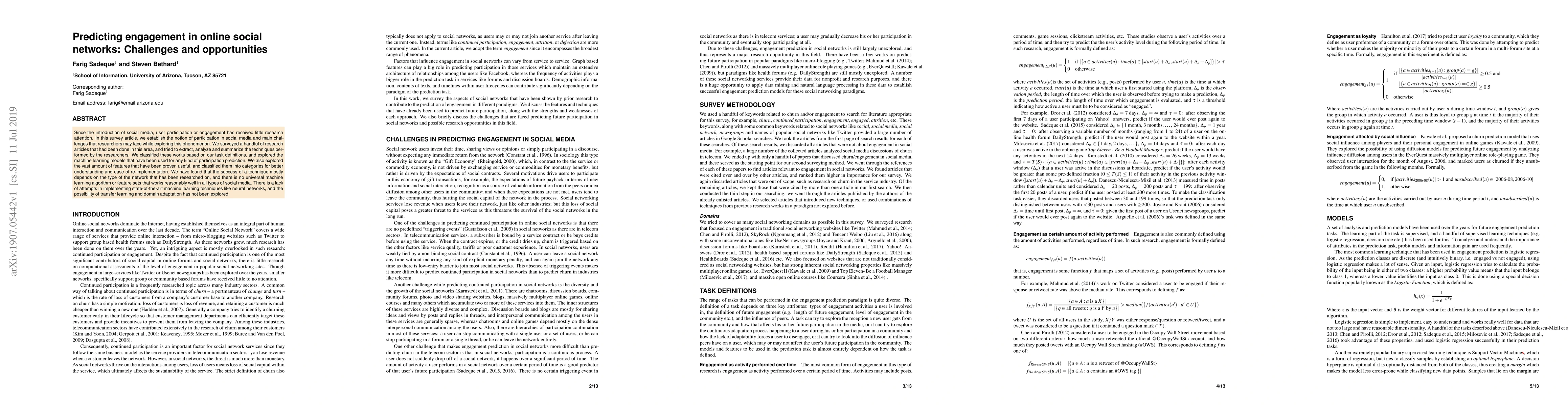 The paper categorizes and analyzes various machine learning models and features used in predicting user engagement in social networks, identifying gaps in current research.