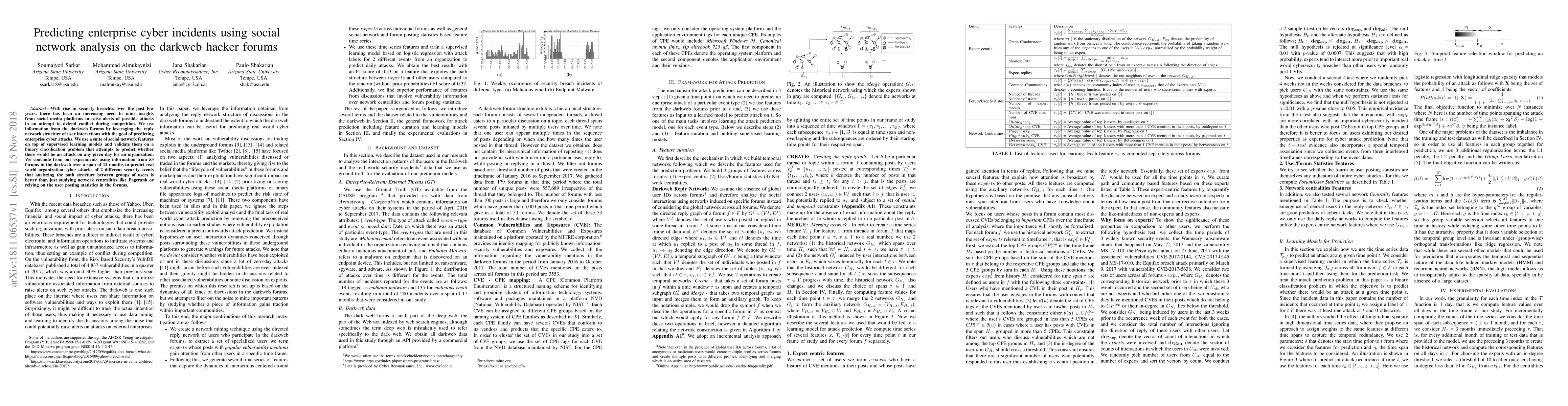 This research uses social network analysis on darkweb hacker forums to predict enterprise cyber incidents by examining user interaction patterns. Findings suggest that analyzing the path structure between user groups is more effective than relying on network centralities or user posting statistics for predicting cyber attacks.