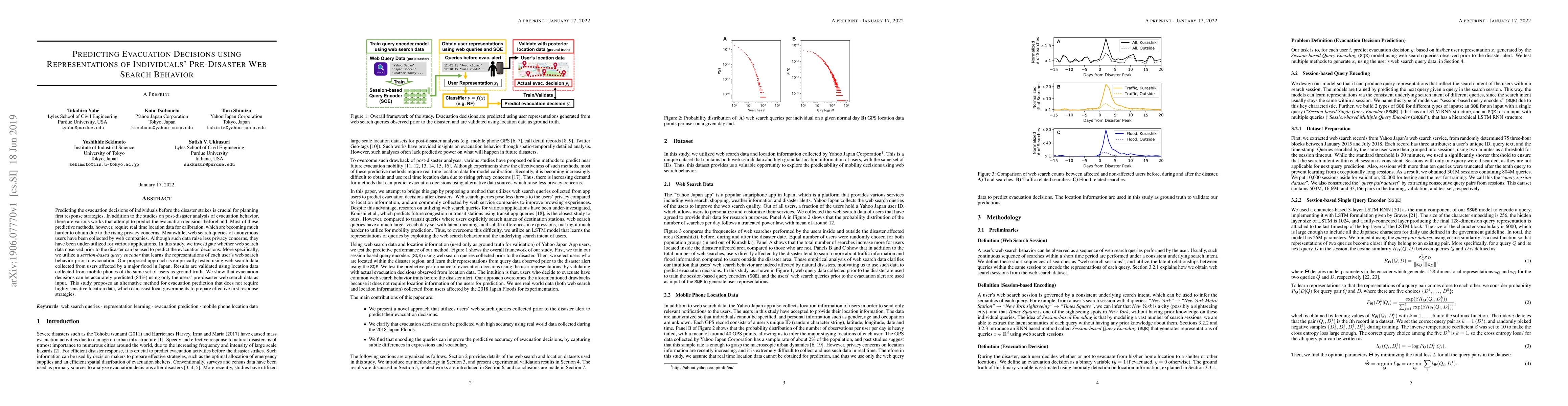 This study explores predicting evacuation decisions using individuals' pre-disaster web search behavior, employing a session-based query encoder to learn user representations. The method was tested on Japanese flood data, achieving 84% accuracy, offering a privacy-friendly alternative to location-based predictive methods.